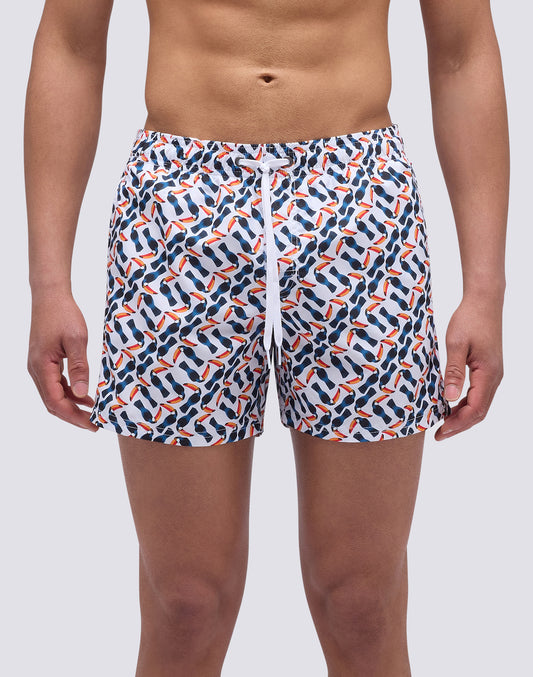 SHORT SWIMSUIT WITH ELASTIC WAIST AND MULTI TOUCAN PRINT