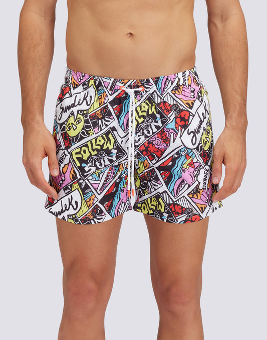 REPREVE® ELASTICATED WAIST SHORT SWIMSHORTS WITH COMIC PRINT