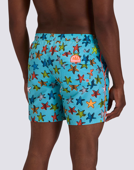MEN'S MID-LENGTH SWIMSHORTS WITH ELASTIC WAIST AND HAPPY STAR PRINT IN REPREVE® RECYCLED POLYESTER