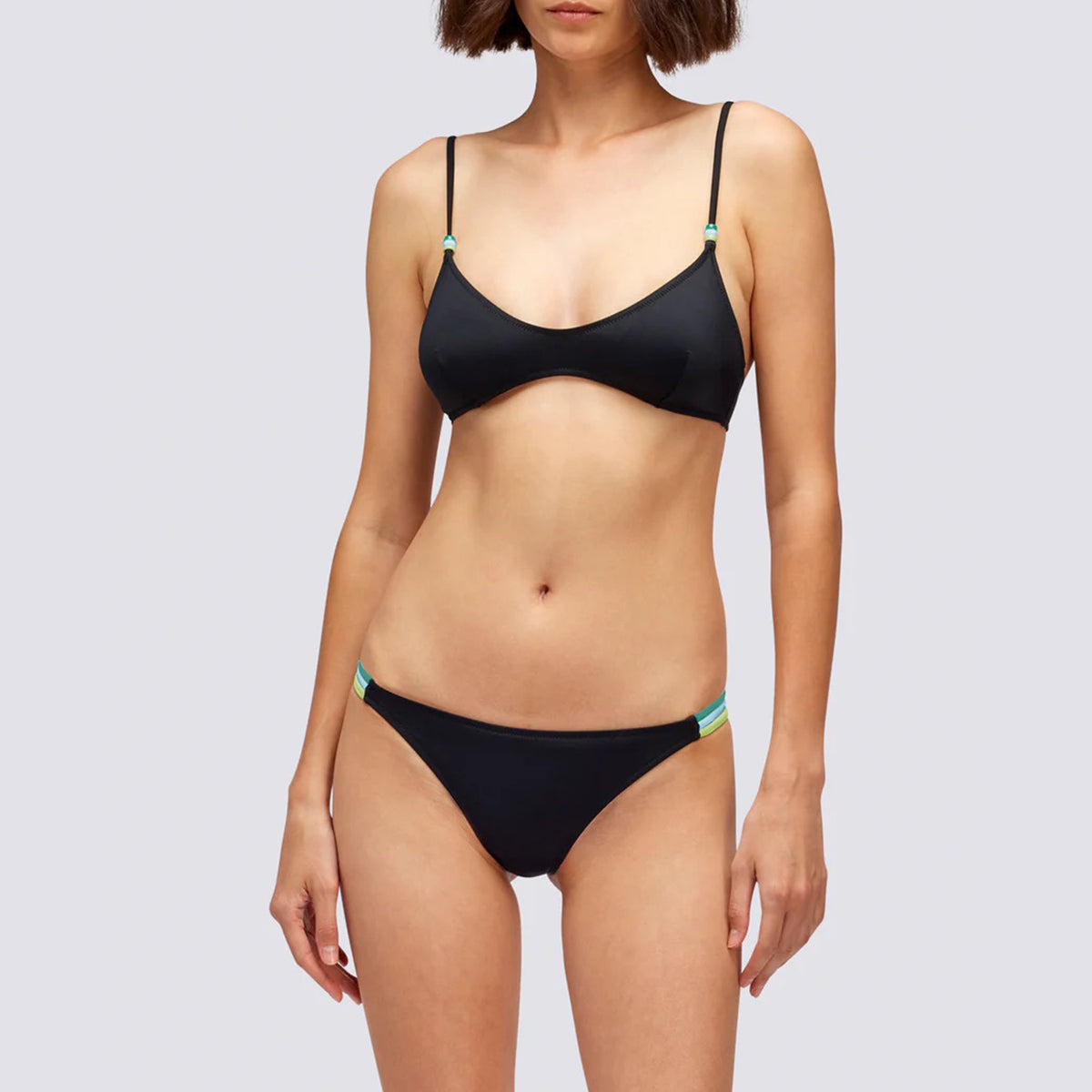 This bikini model combines a bralette top with Brazilian briefs for a trendy combination that offers comfort, a touch of sensuality and naturally enhances the silhouette, suitable for those looking for a fashionable look without sacrificing comfort. The bralette offers light to medium support, ideal for small to medium breasts. The lack of underwire makes it very comfortable to wear, and the coverage is variable depending on the model. The Brazilian briefs, on the other hand, are distinguished by less coverage at the back than classic briefs; they usually have a V-shape or rounded back that flatters the buttocks. They generally have a higher leg cut than traditional briefs, which tends to elongate the figure.