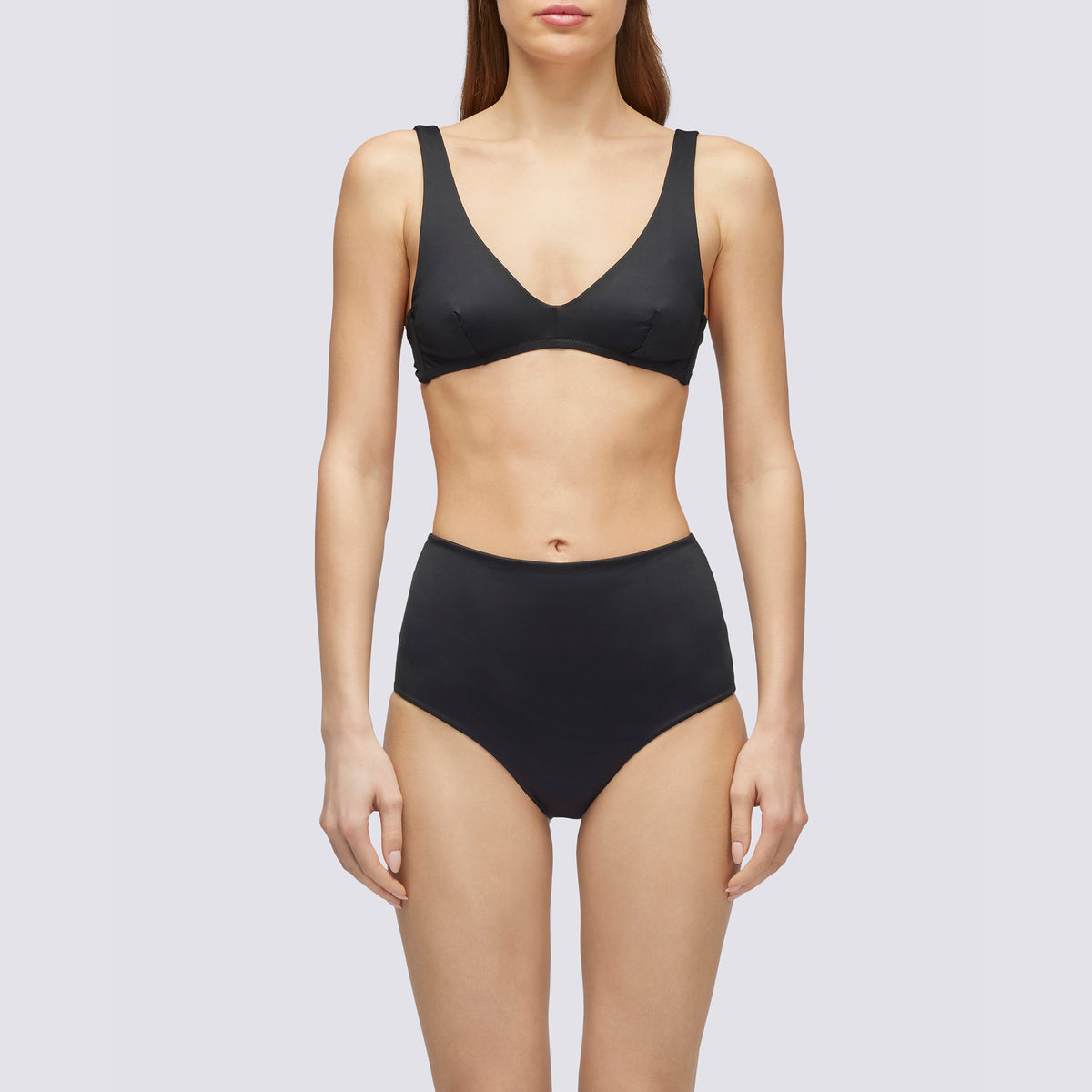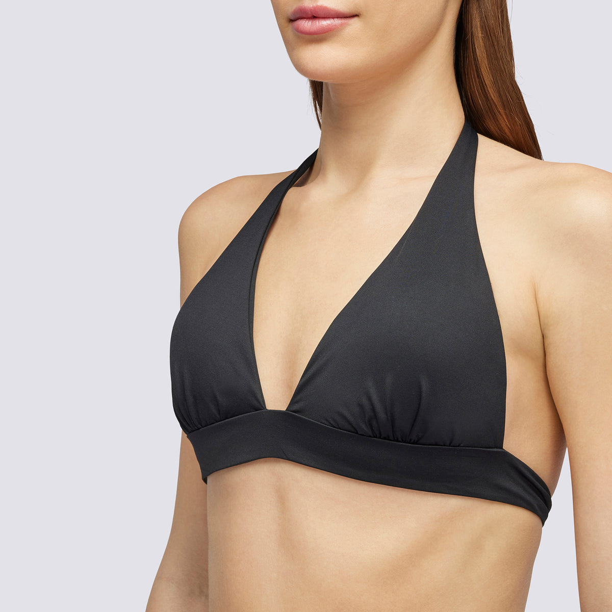 The wide-strap bikini top is designed to offer comfort, support and a dynamic look. The wide straps are the main feature, as they offer greater support than thin straps, distributing weight better and reducing pressure on the shoulders. They can be straight, crossed at the back or feature special designs. The overall line of the top is functional and minimalist. Many styles are wire-free for maximum comfort and freedom of movement and offer more coverage than other types of bikinis. Solid colours, colour blocks or simple geometric prints prevail. Although sporty in nature, this style can be paired with different types of bottoms to create more or less casual looks.
