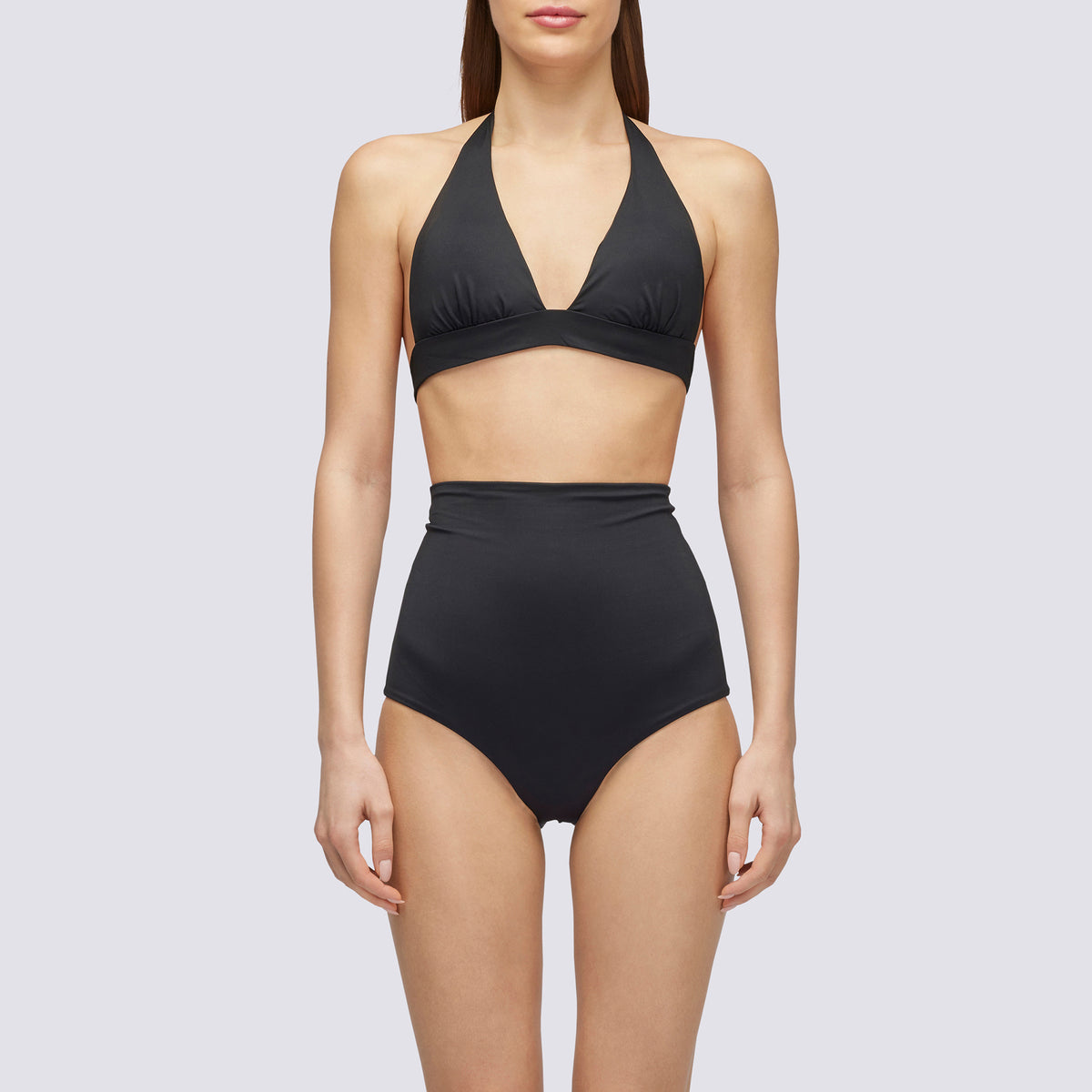 The high-waisted bikini bottom is a style that stands out for its waistband that sits above the navel, often reaching the waistline or even higher. It is a design that evokes a retro style and offers a unique fit. It provides more coverage on the abdominal area than other styles. The high waist tends to emphasise the waistline, creating an hourglass silhouette, especially when paired with a top that leaves the upper abdomen exposed. It can have a distinctly vintage look, but there are also modern versions with more minimalist cuts. The high waistband can offer a slightly supportive effect on the abdominal area, shaping the silhouette. The coverage of the buttocks can vary depending on the model, from full to more high-cut or “cheeky”. To wear it correctly, it is essential that the high waistband is not too tight and that the briefs fit well without creating folds.