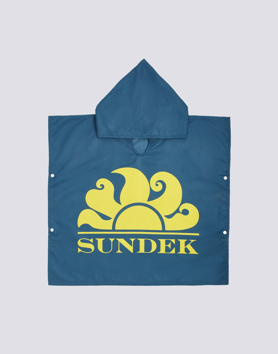 An essential accessory, also suitable as a gift idea. It is the microfibre poncho for children, with a front Sundek print and hood. In light fabric obtained from recycling. Available for boy and girl and 2 color variants.