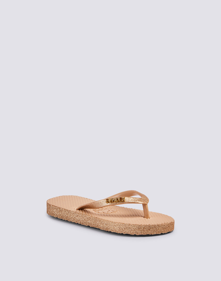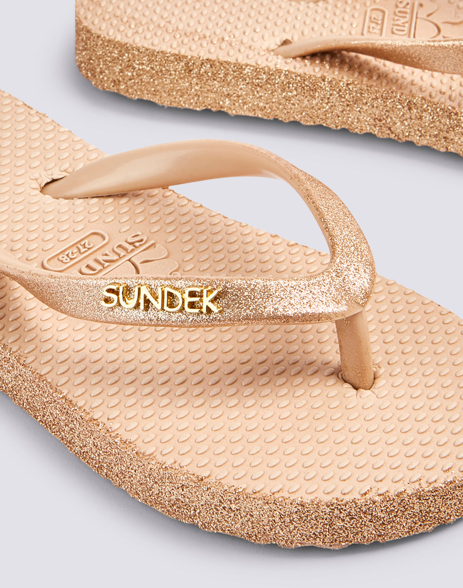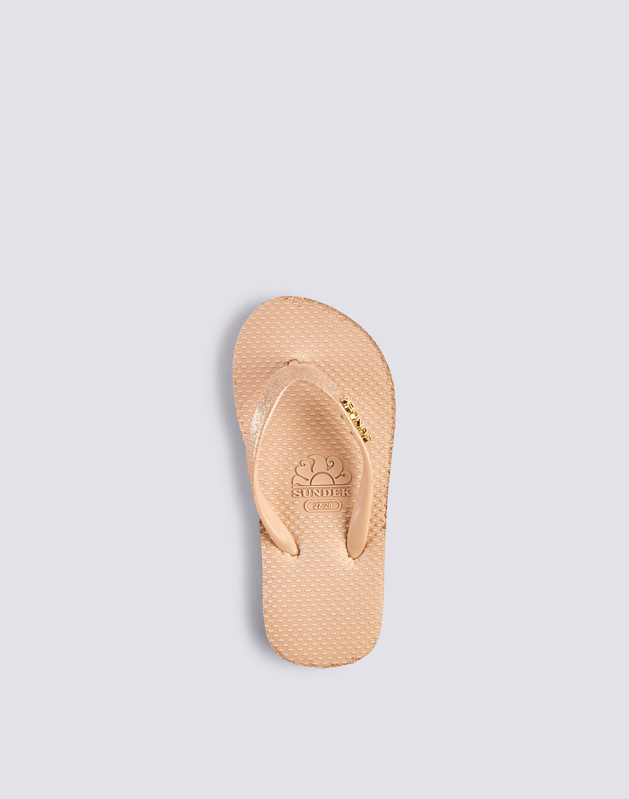 Mini rubber flip-flops for girls with glittery SUNDEK writing.