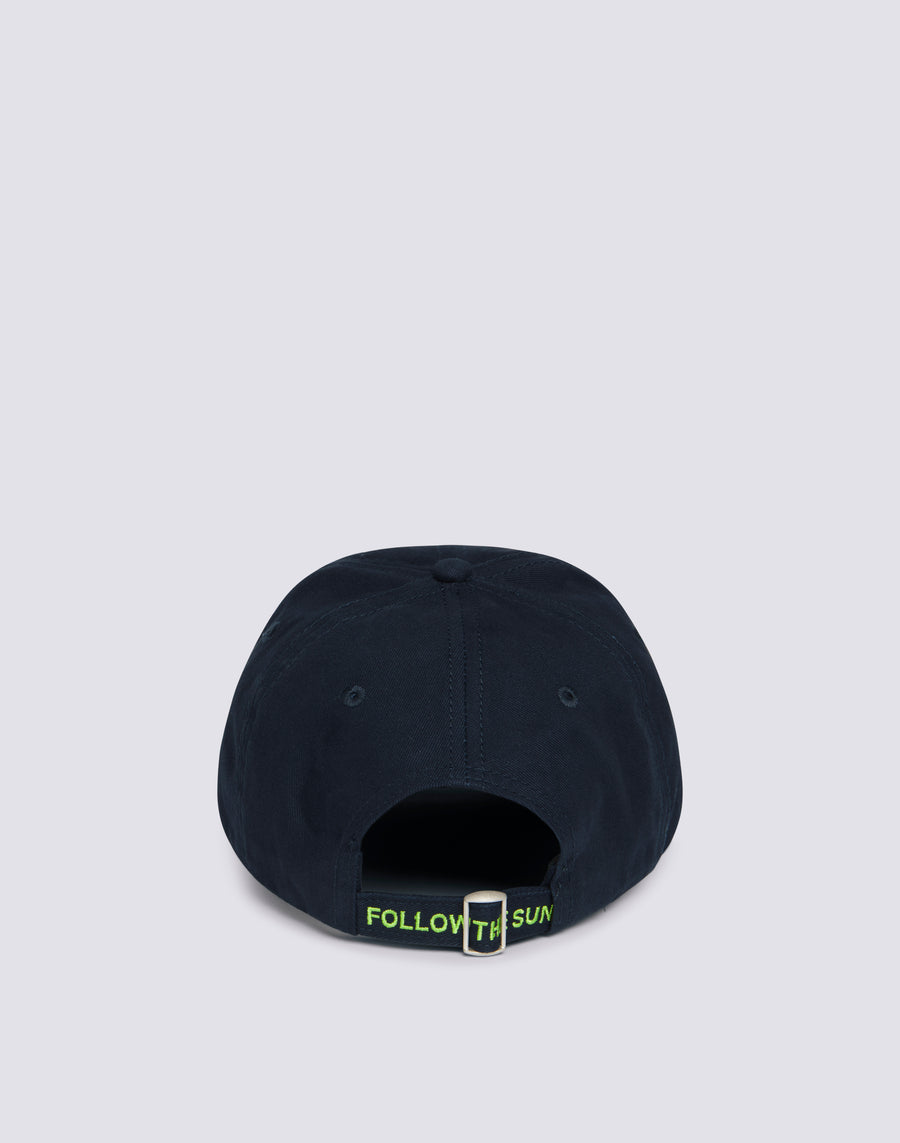 Back closure with adjustable strap and FOLLOW THE SUN writing