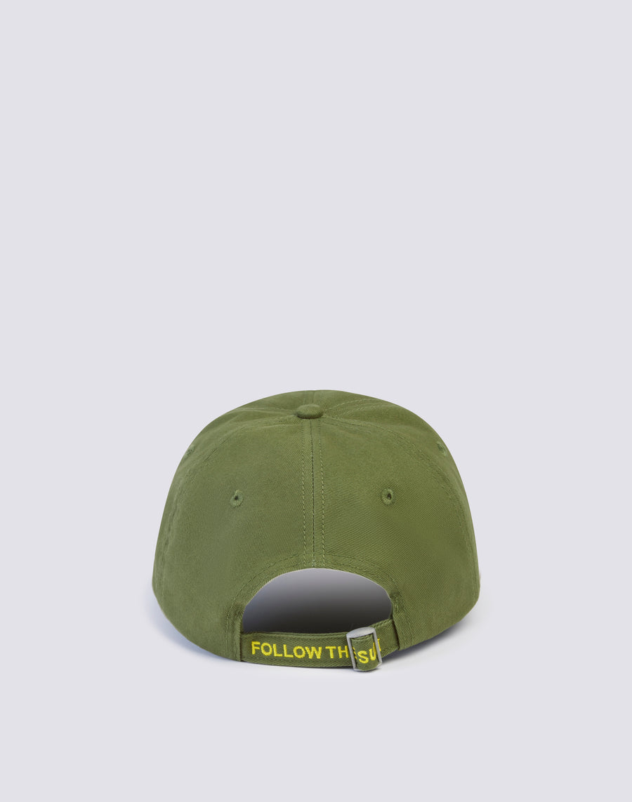 Back closure with adjustable strap and FOLLOW THE SUN writing