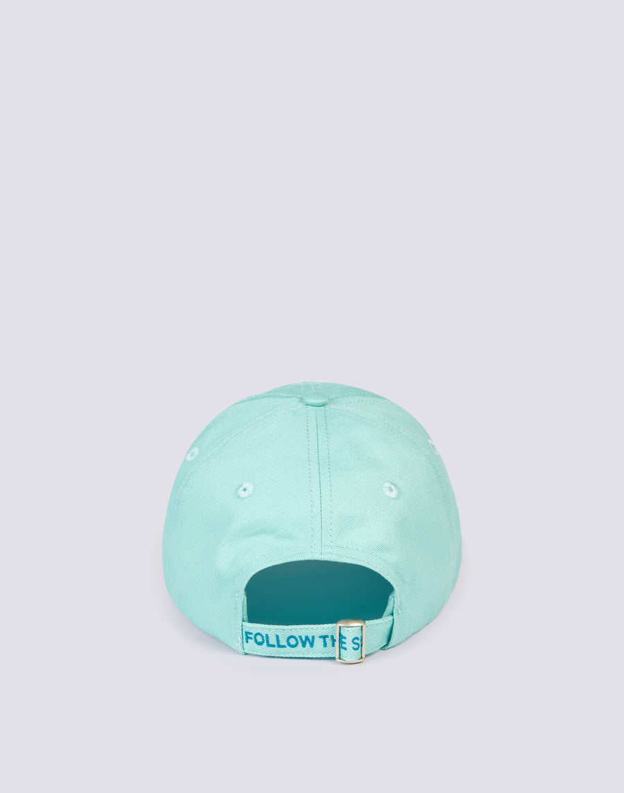 Back closure with adjustable strap and FOLLOW THE SUN writing