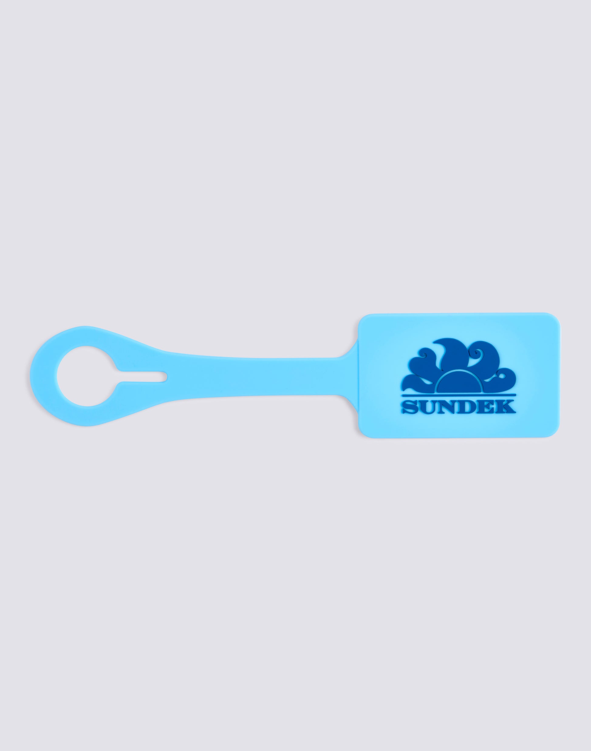 Rubberized silicone luggage tag with engraved contrasting Sundek logo.