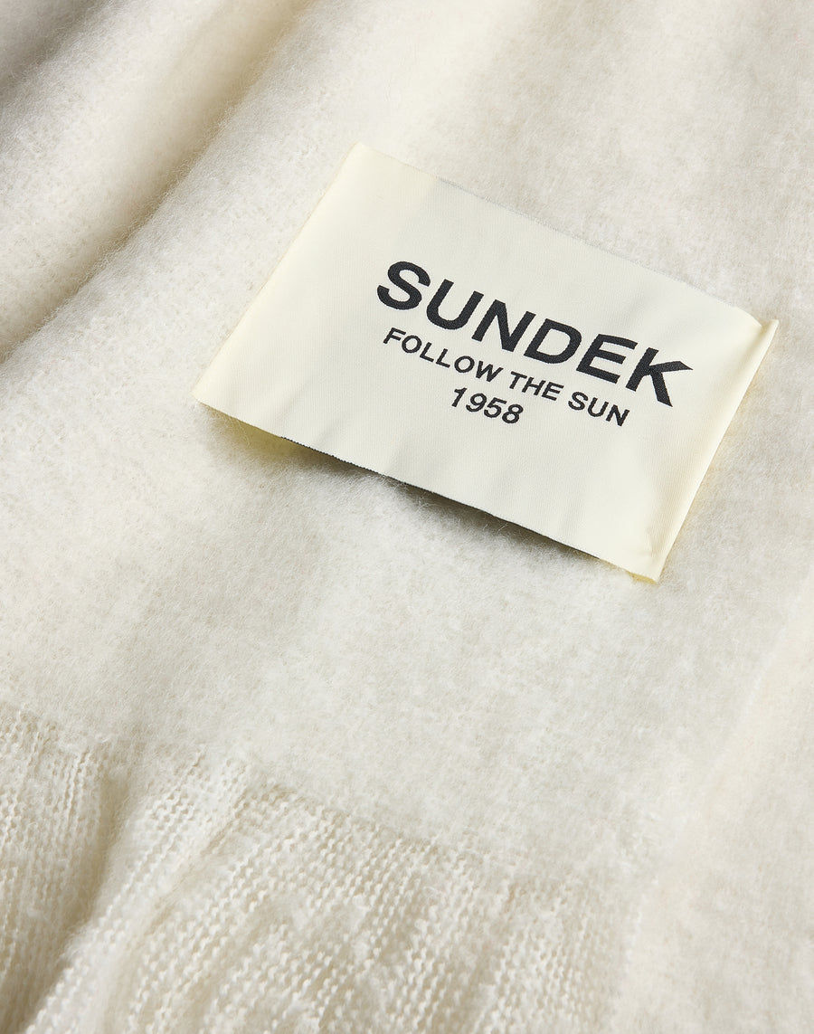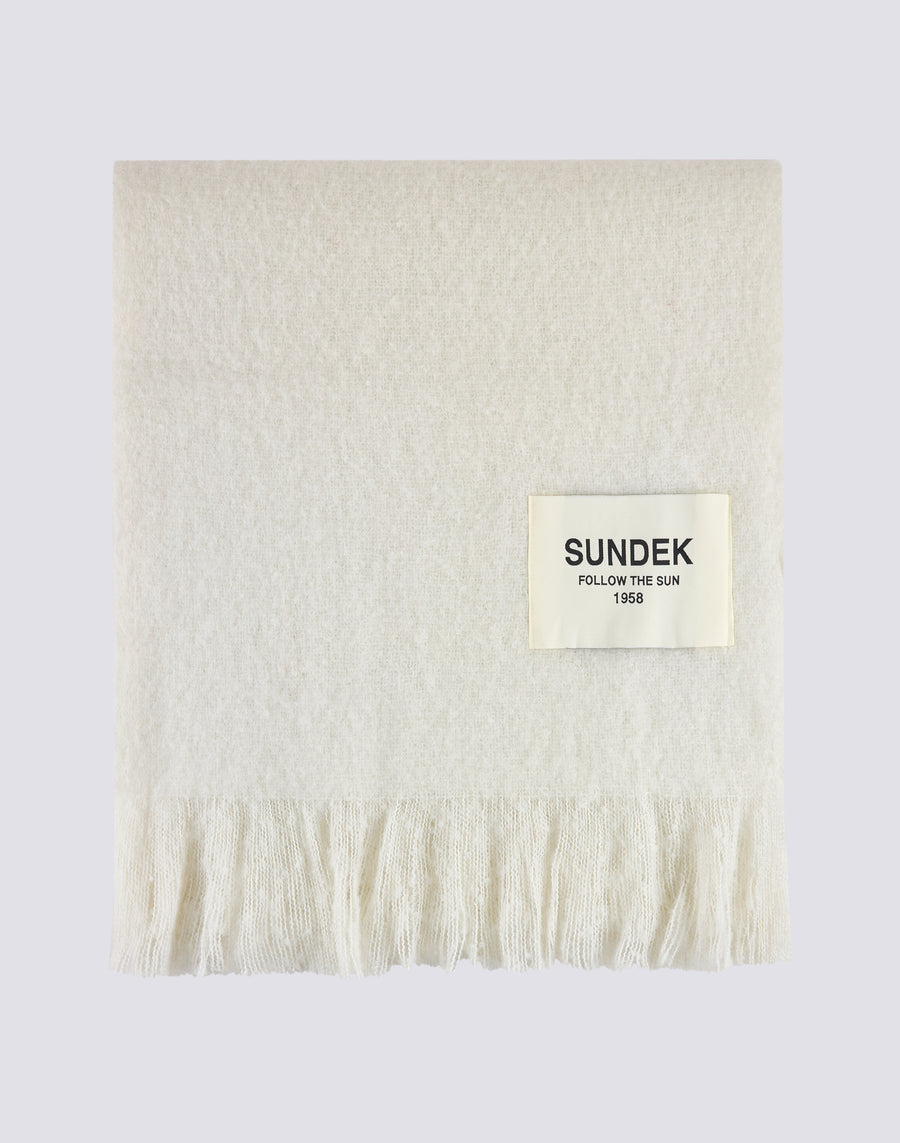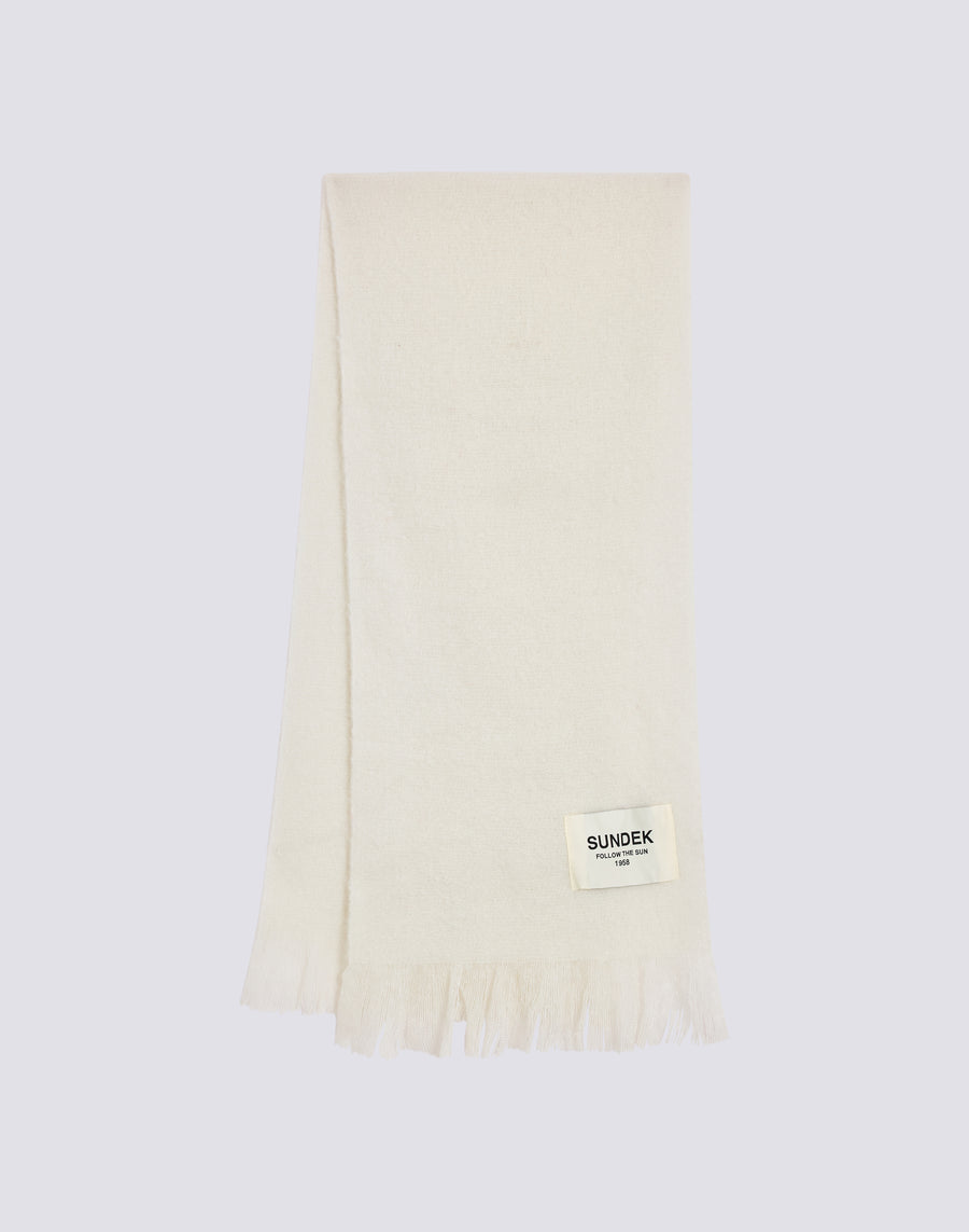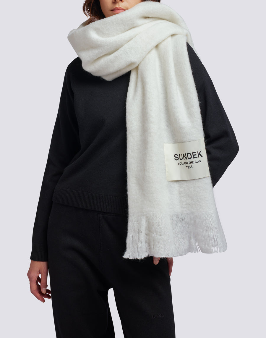 Solid-coloured scarf, large logo label and mini fringes, the must-have accessory for winter days.