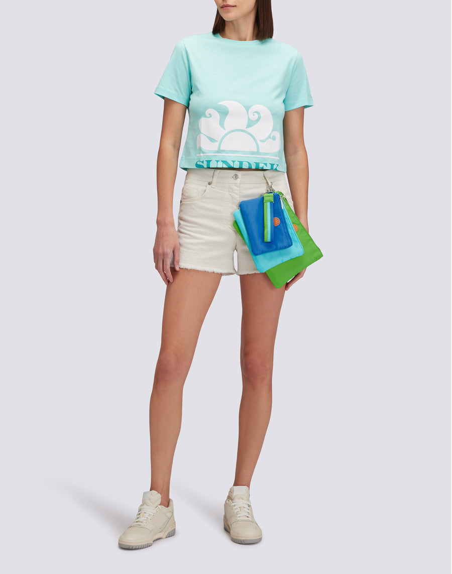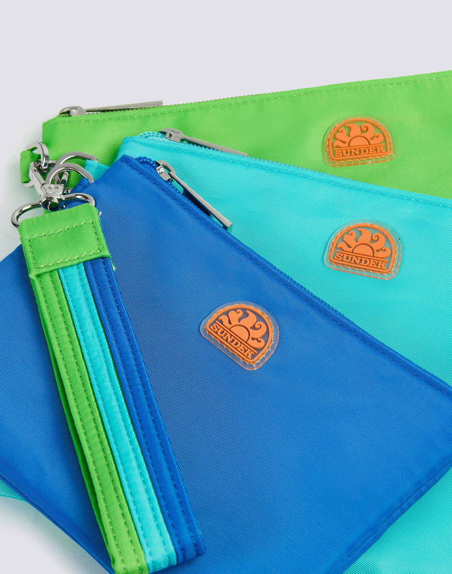 Mini clutch bag made up of 3 bags of different sizes with detachable keyring and rainbow details. Essential, to always carry with you to keep cards, keys, coins, small objects.
