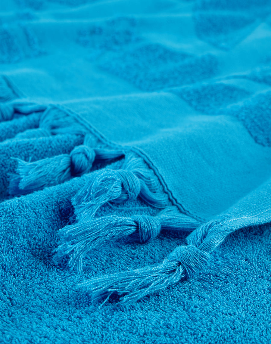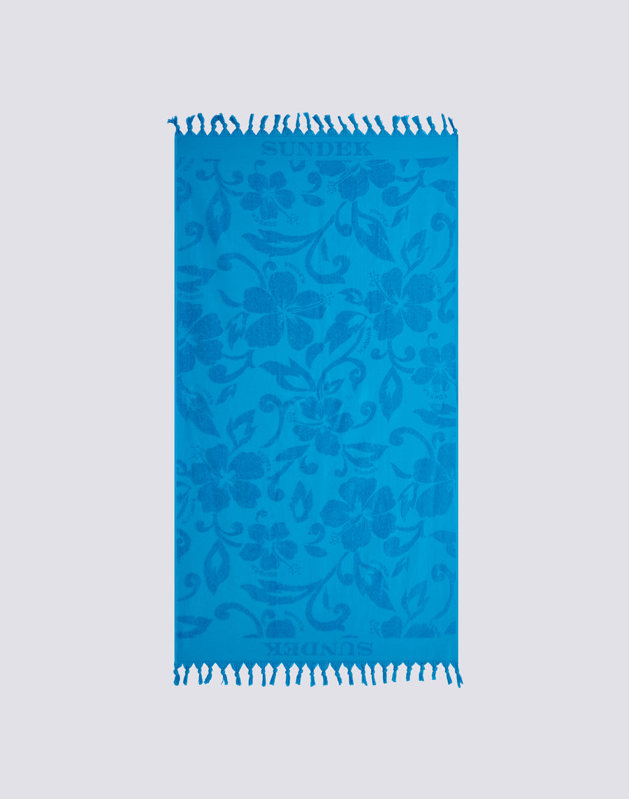 Double-layered terry beach towel and fouta with fringes and SK23 print. Jacquard design. Soft, comfortable, a must-have.