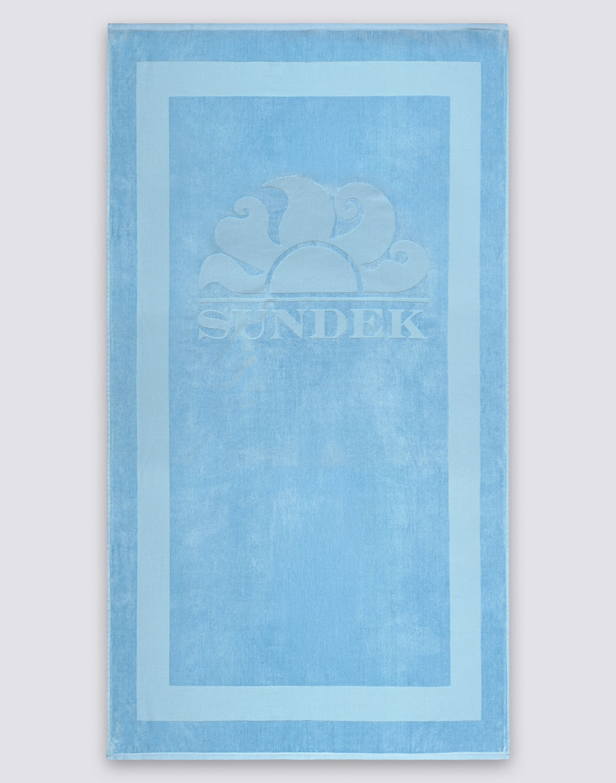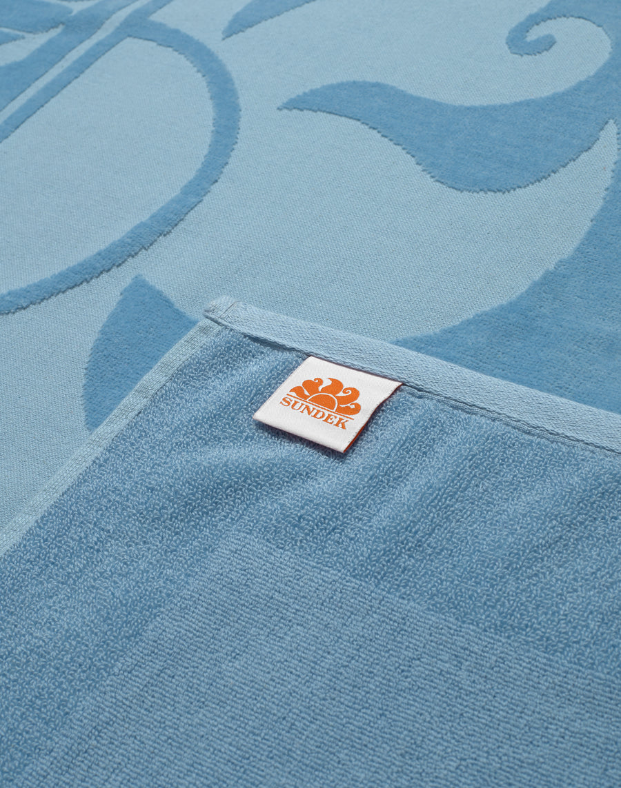 Jacquard terry beach towel with tone-on-tone logo and frame, both embossed.