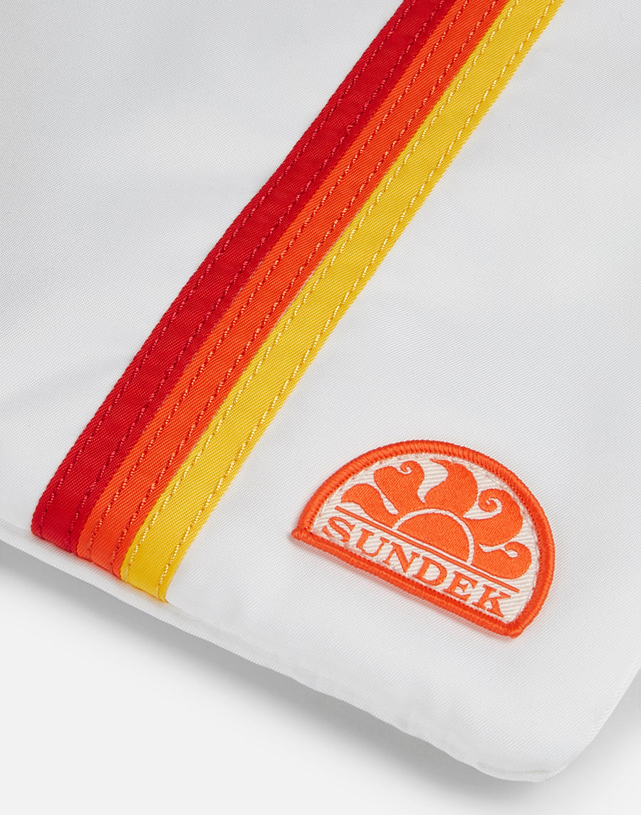 Lightweight lined beach clutch bag finished with the iconic tricolour ribbons, perfect for holding and protecting all the essentials you prefer to keep close at hand. You can carry it inside another bag or on its own thanks to the practical wrist strap.