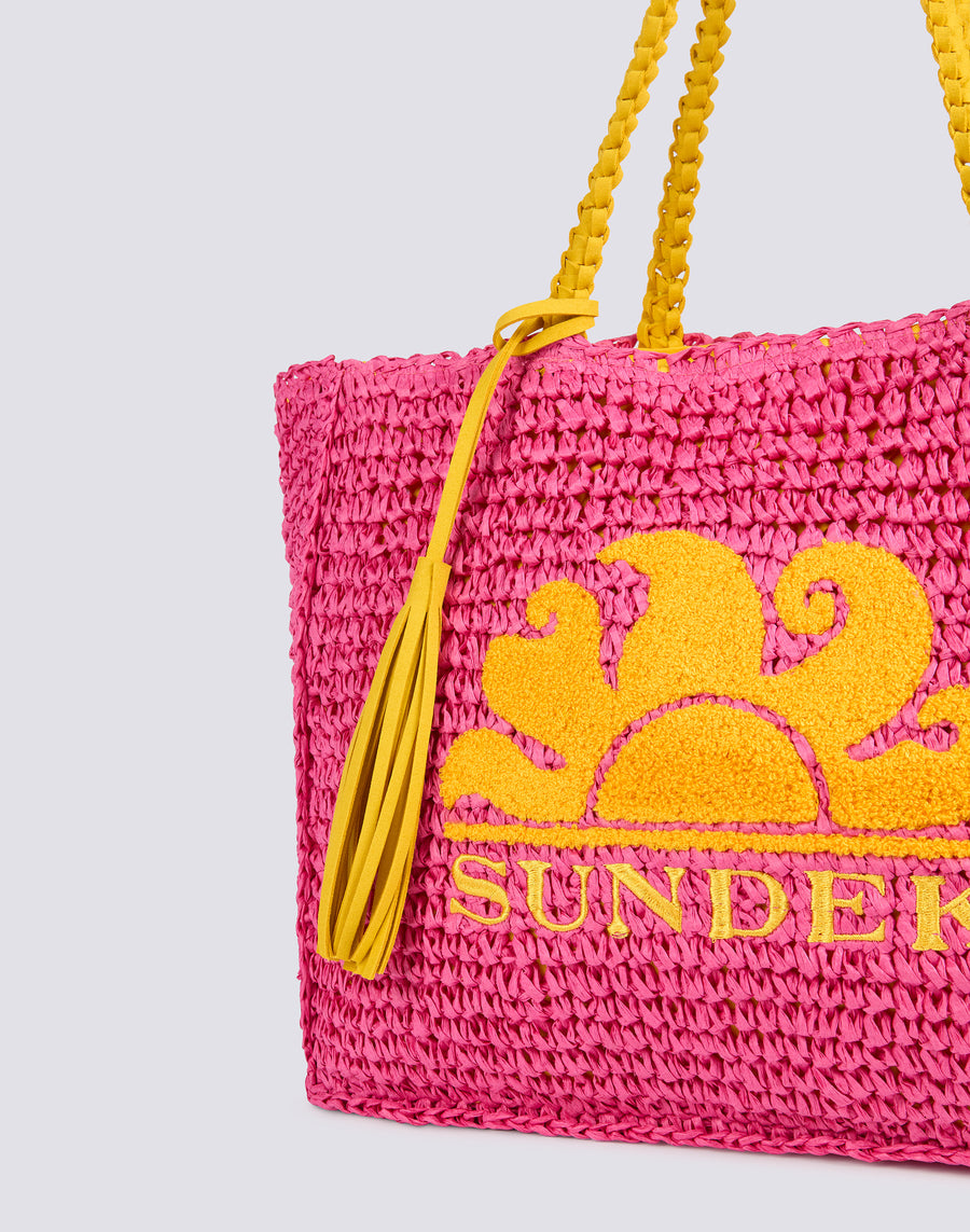 Paper straw shopping bag with terry cloth logo and embroidery on the front. A shopping bag with a simple design, but full of details, that will make you stand out.