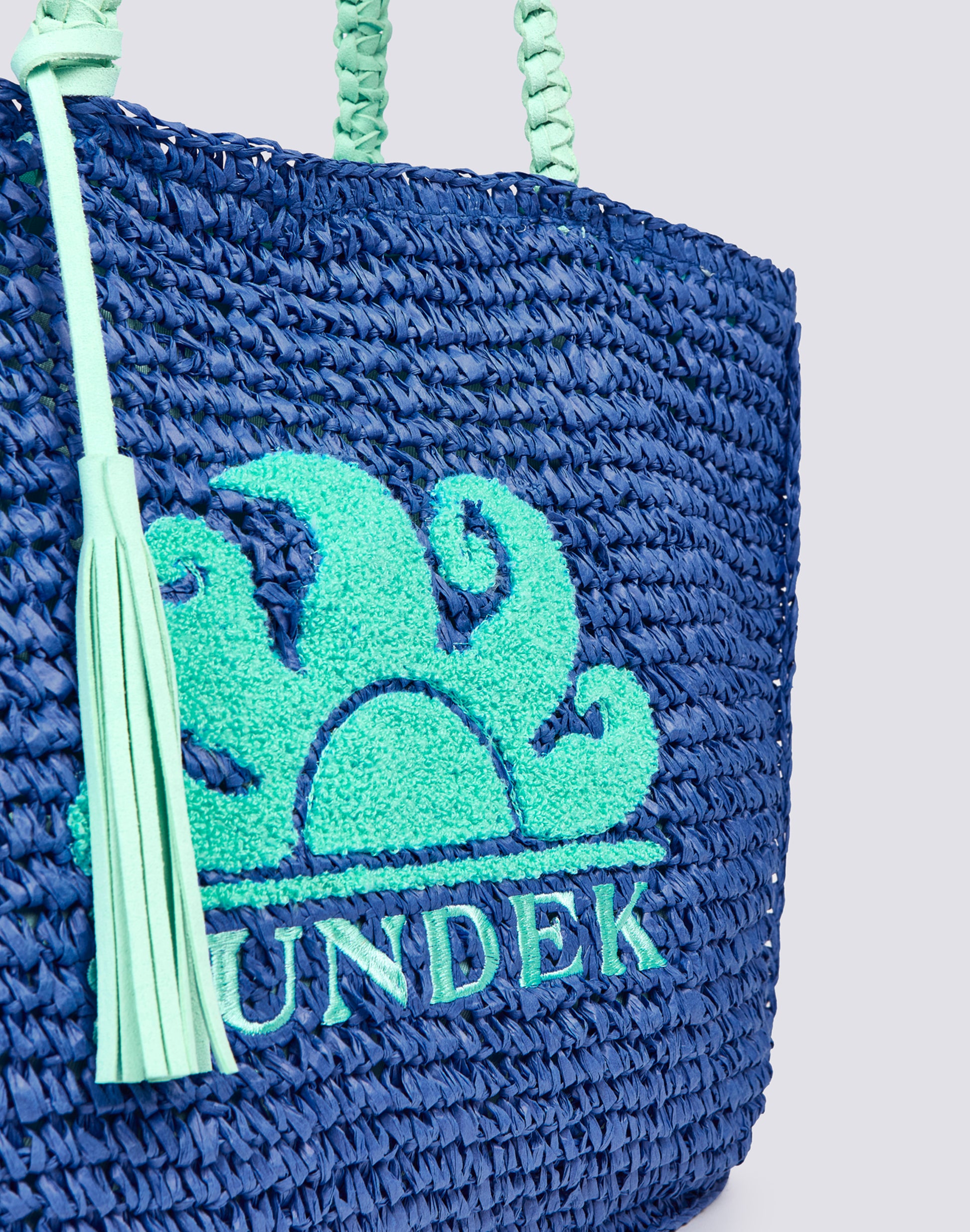Paper straw shopping bag with terry cloth logo and embroidery on the front. A shopping bag with a simple design, but full of details, that will make you stand out.