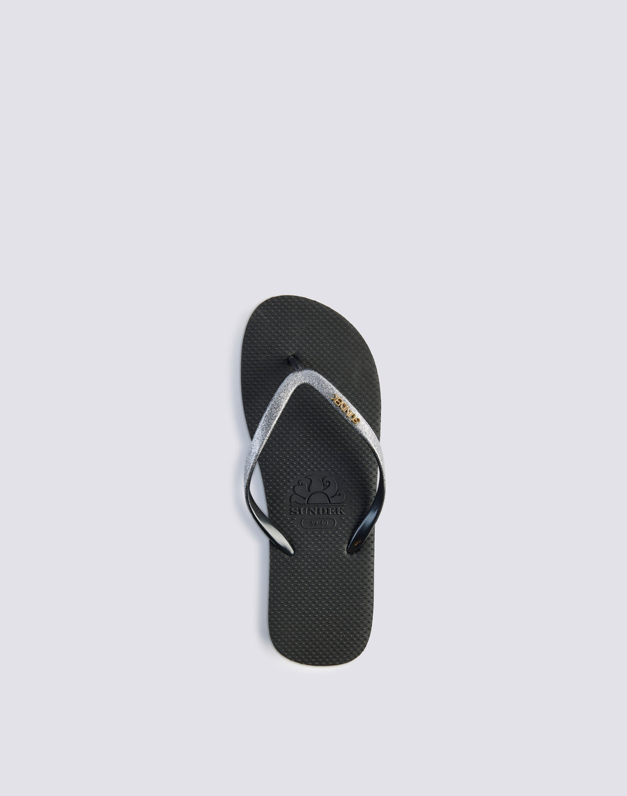 Flip flops with glitter and high sole, bright and original to combine with an accessory and a swimsuit to give life to a particular and never banal beach look. Sole height 4 cm.