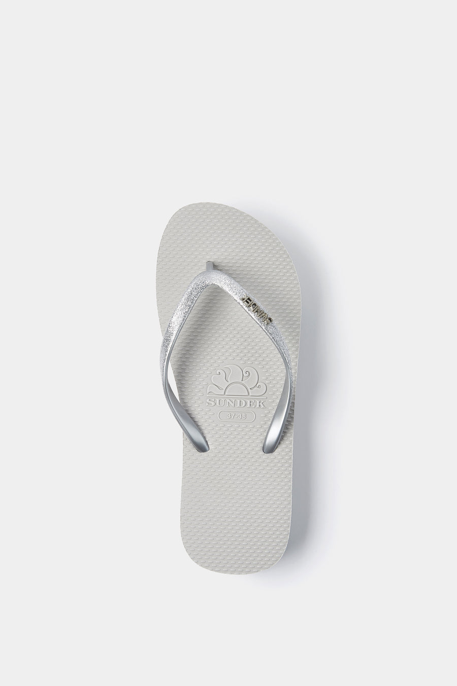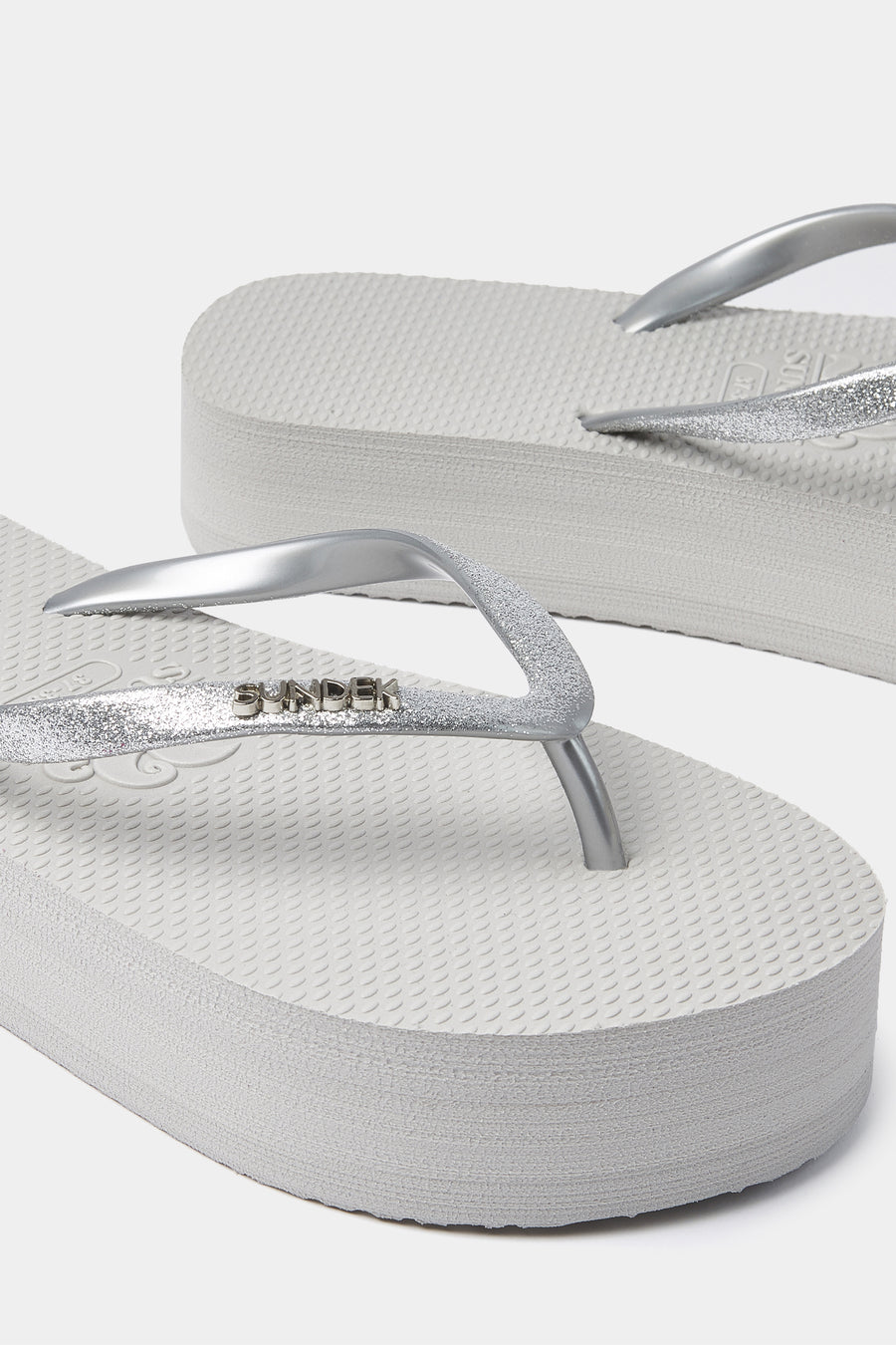 Flip flops with glitter and high sole, bright and original to combine with an accessory and a swimsuit to give life to a particular and never banal beach look. Sole height 4 cm.