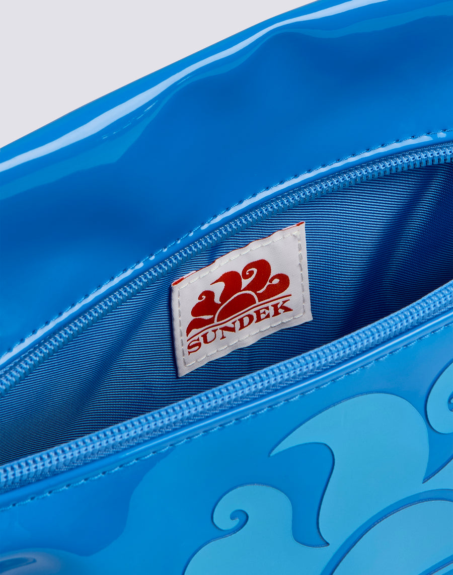 Waterproof beach clutch bag with carabiner and finger loop, to take with you wherever you want. A versatile clutch bag that can be used on its own with the hand strap or attached to bags and backpacks thanks to the practical carabiner. The shiny effect and front stitching give the clutch bag an essential touch of character. It is also waterproof to protect your most important items. Dimensions: 22 x 27 cm