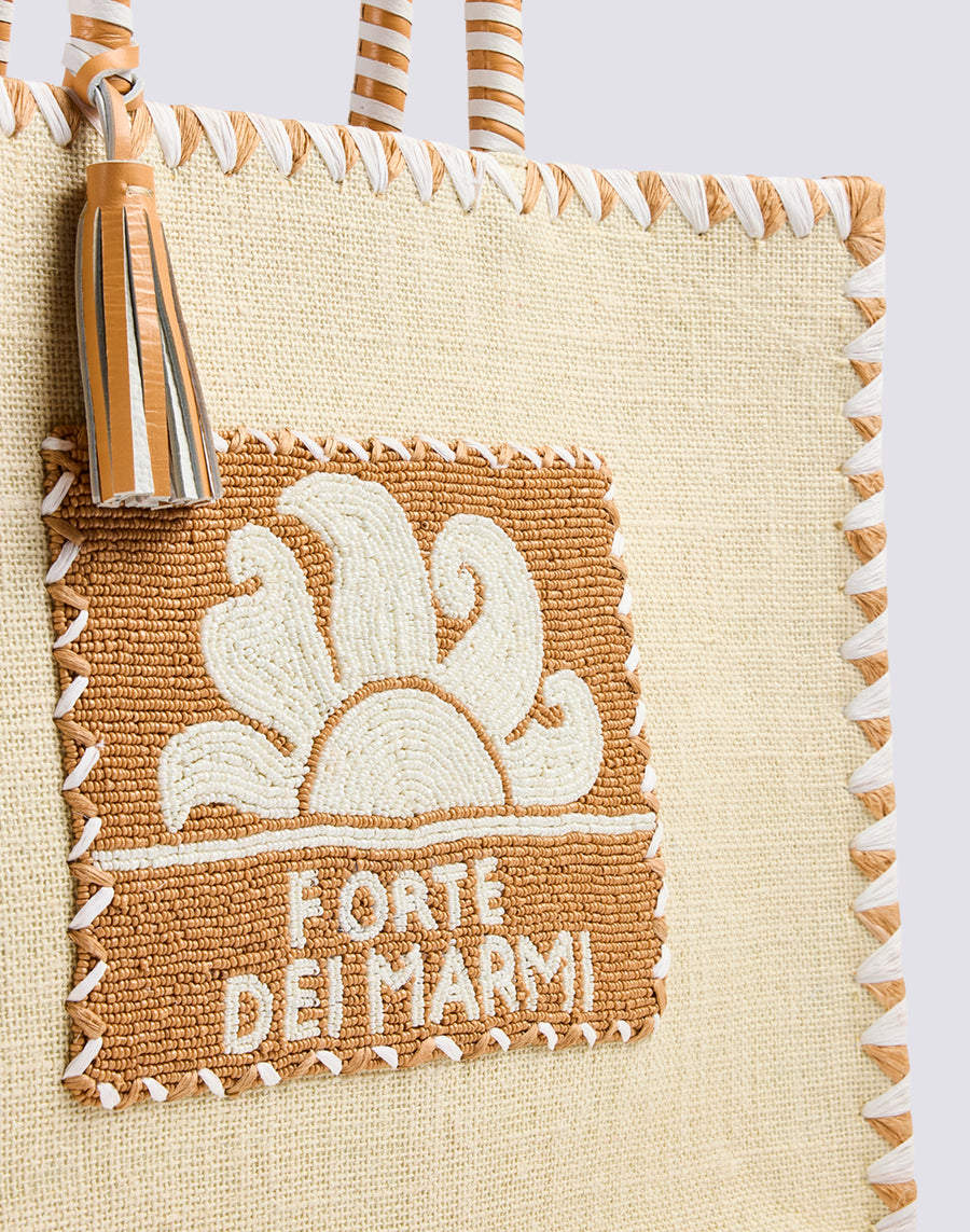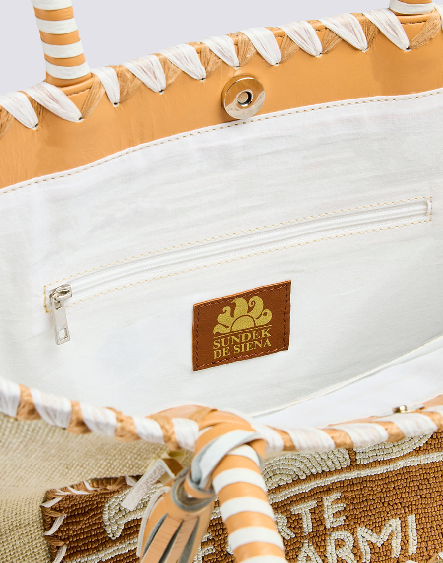 Reinforced canvas bag with hand-embroidered raffia profiles. Equipped with internal pockets with zip closure, handle covered in real leather and magnetic closure with snap button. The maxi central embroidery is handmade with glass beads.