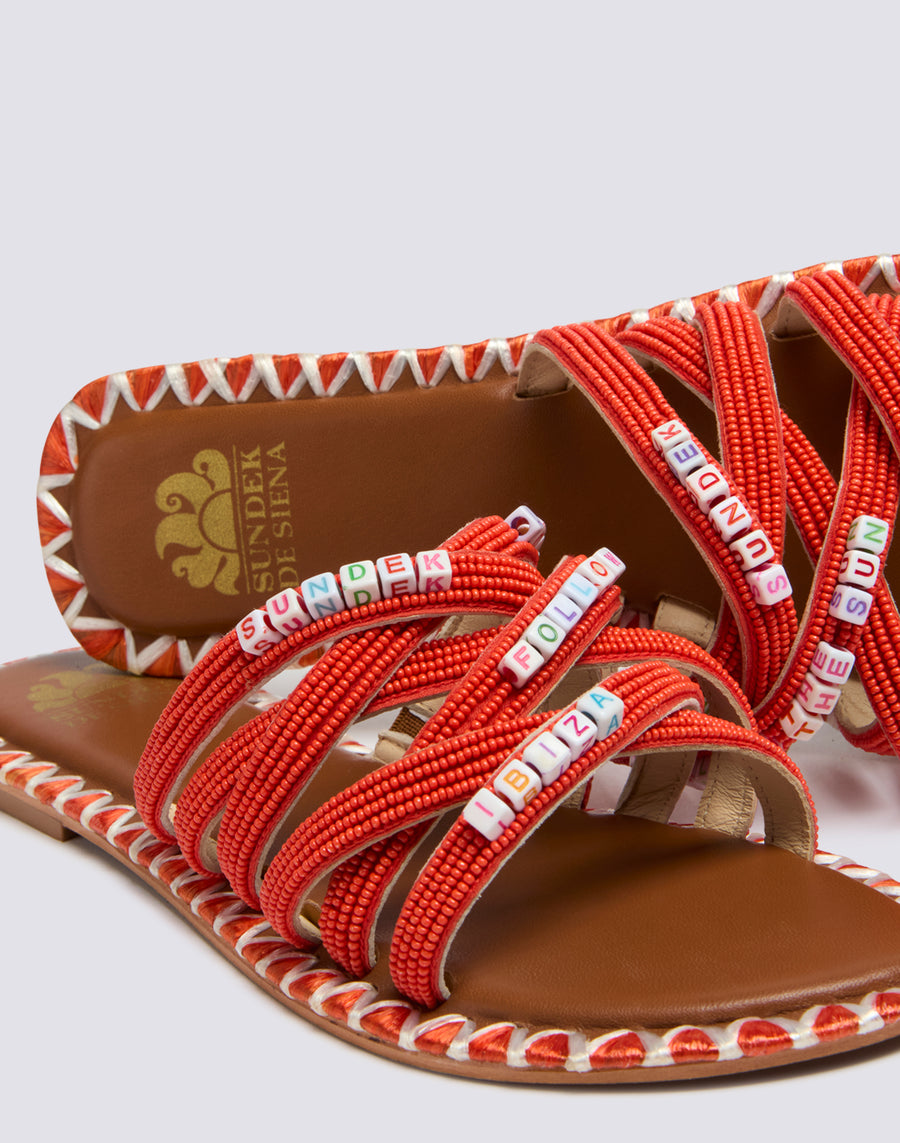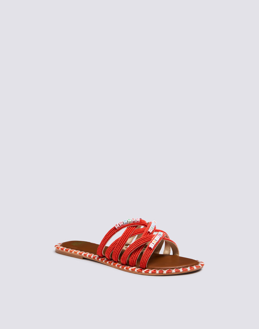 Slipper with laces entirely hand-embroidered with glass beads and cubes with multicolored letters. Genuine leather sole profiled by handcrafted raffia embroidery and gold-coloured embossed logo.