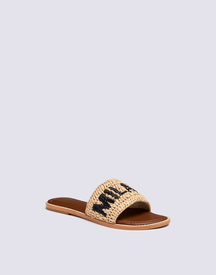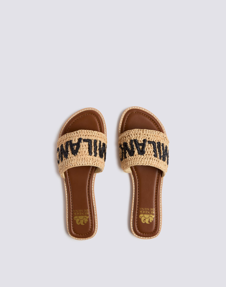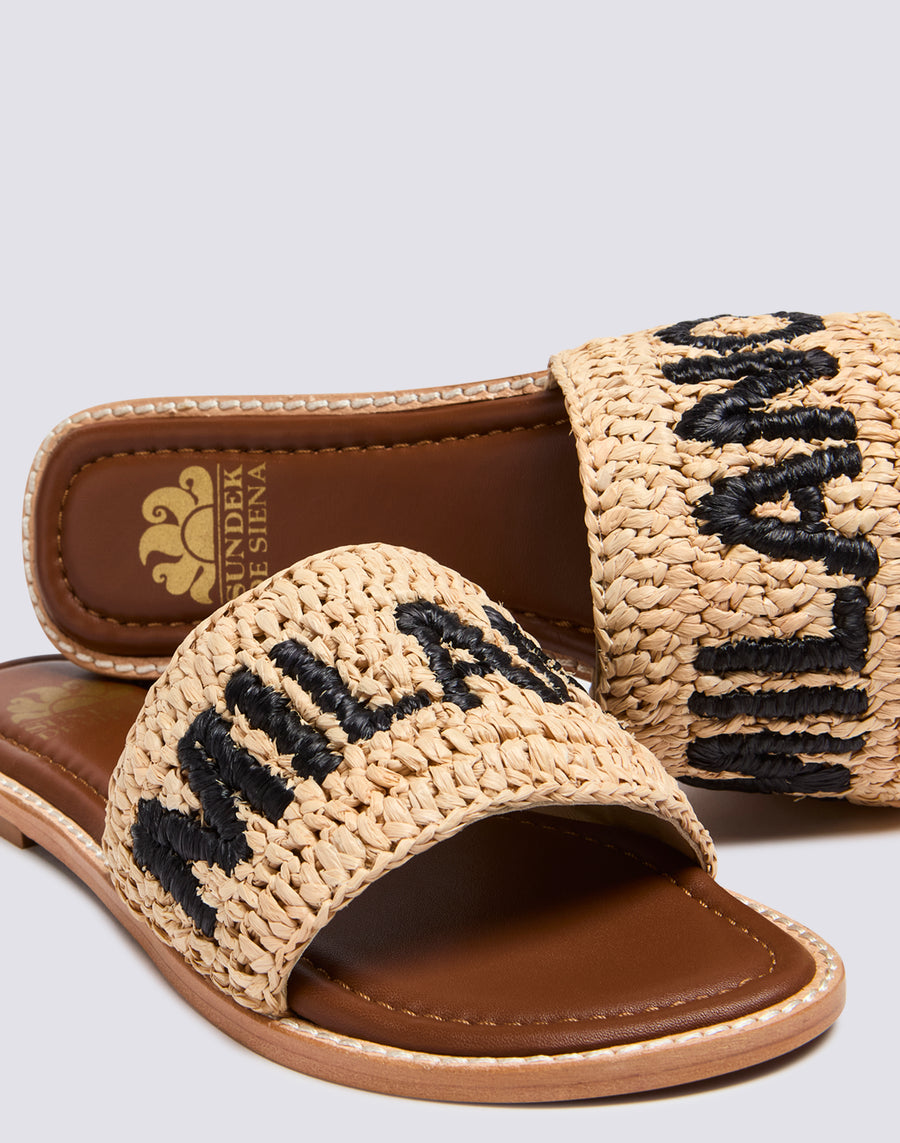 Bandeau slipper in raffia entirely hand-woven and hand-embroidered name of the city. The sole is in real leather.