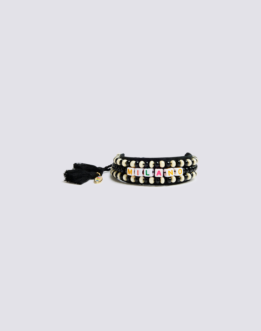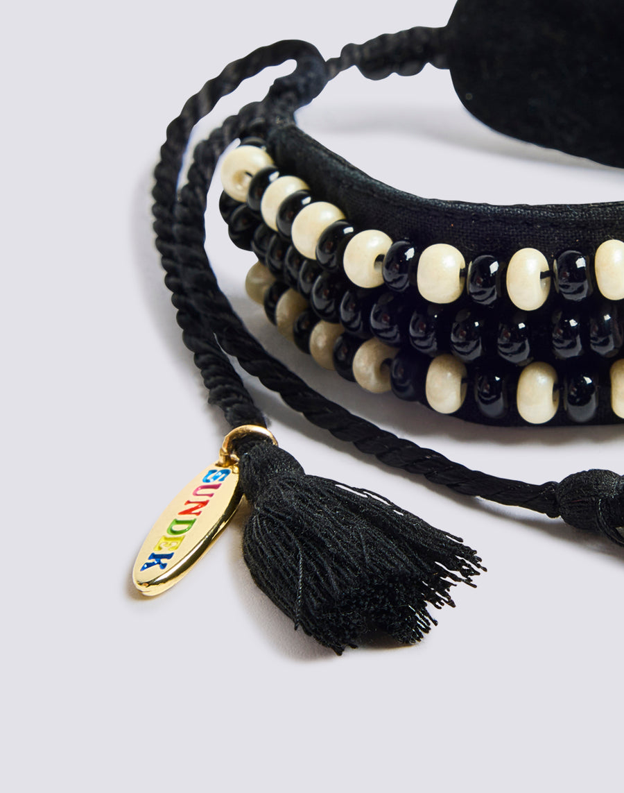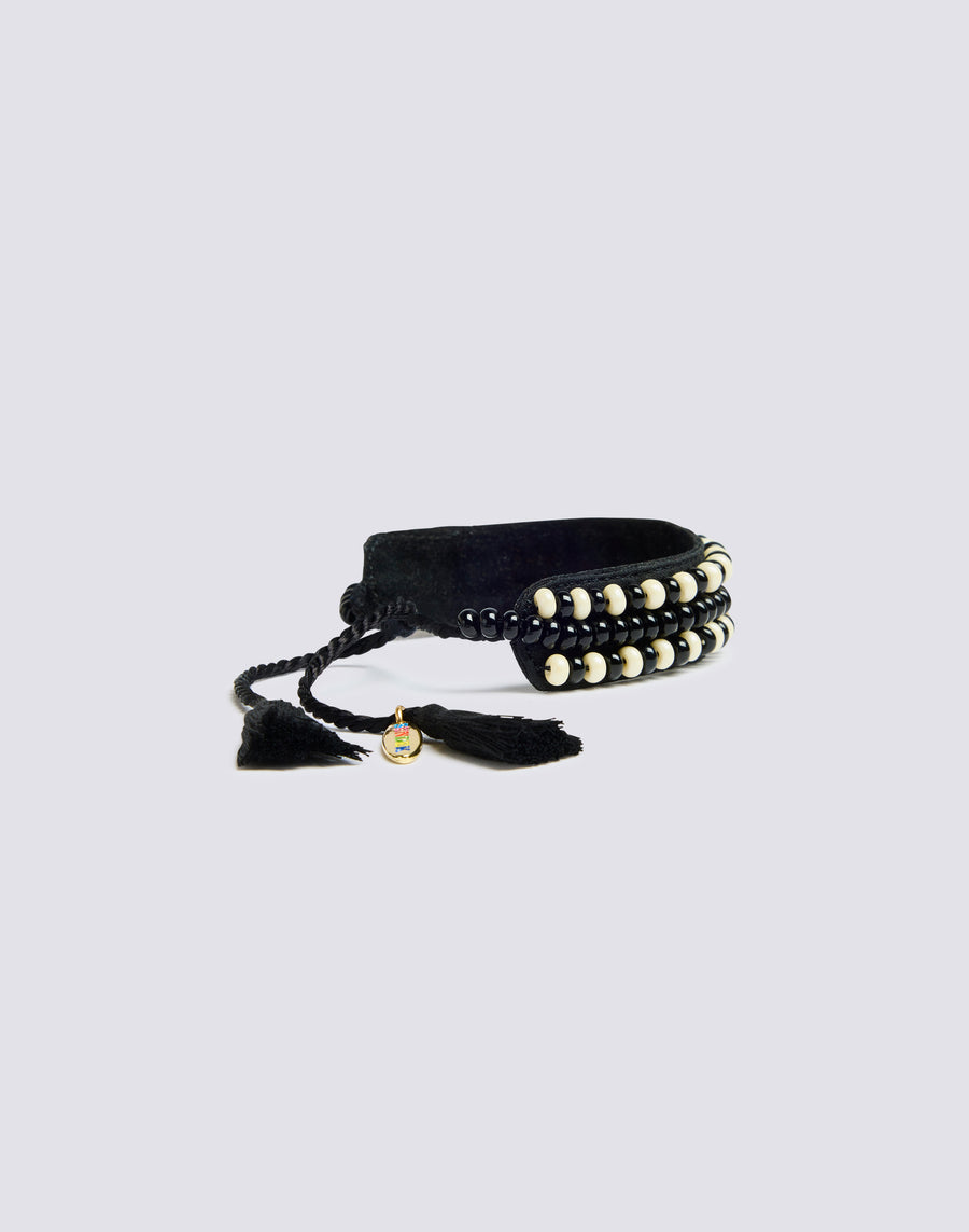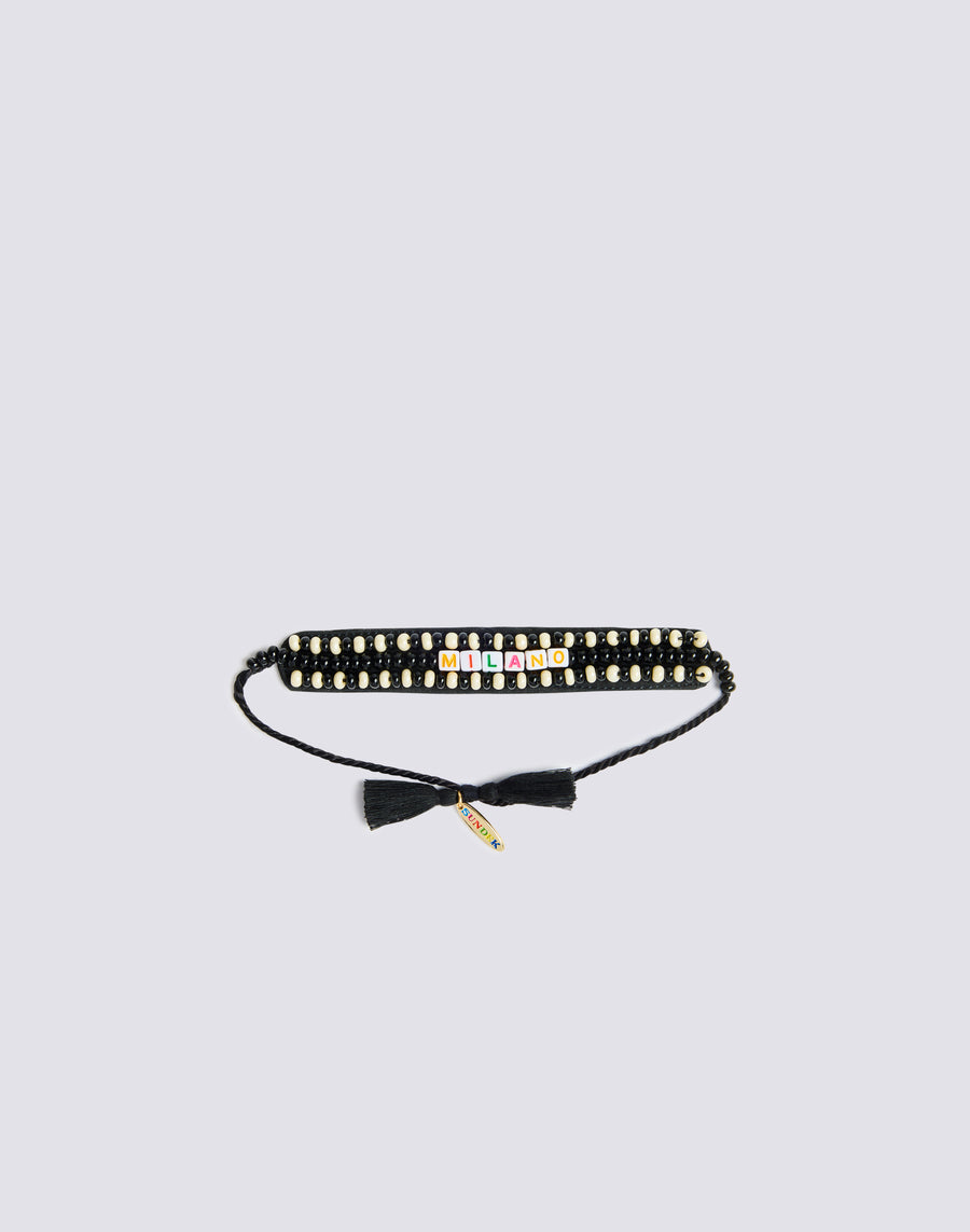 Hand embroidered bracelet with glass beads and cubes with multicolored letters. Featuring an adjustable closure with tassels on the bottom and a surf-shaped metal charm. It is sold together with its dustbag printed with our iconic SK23 pattern and gold-colored logo.