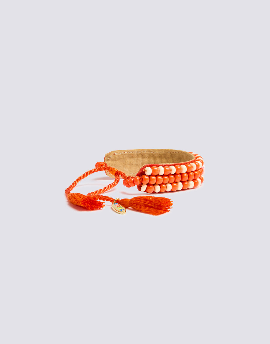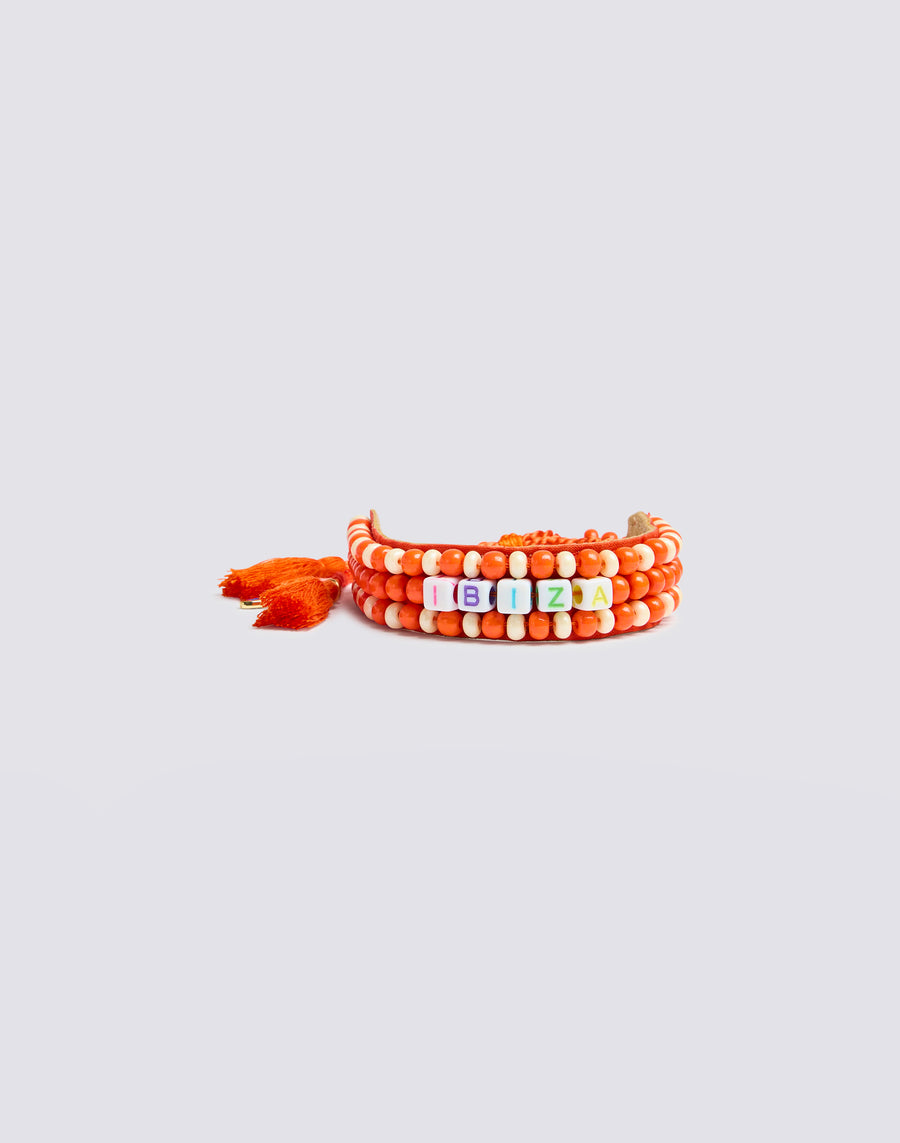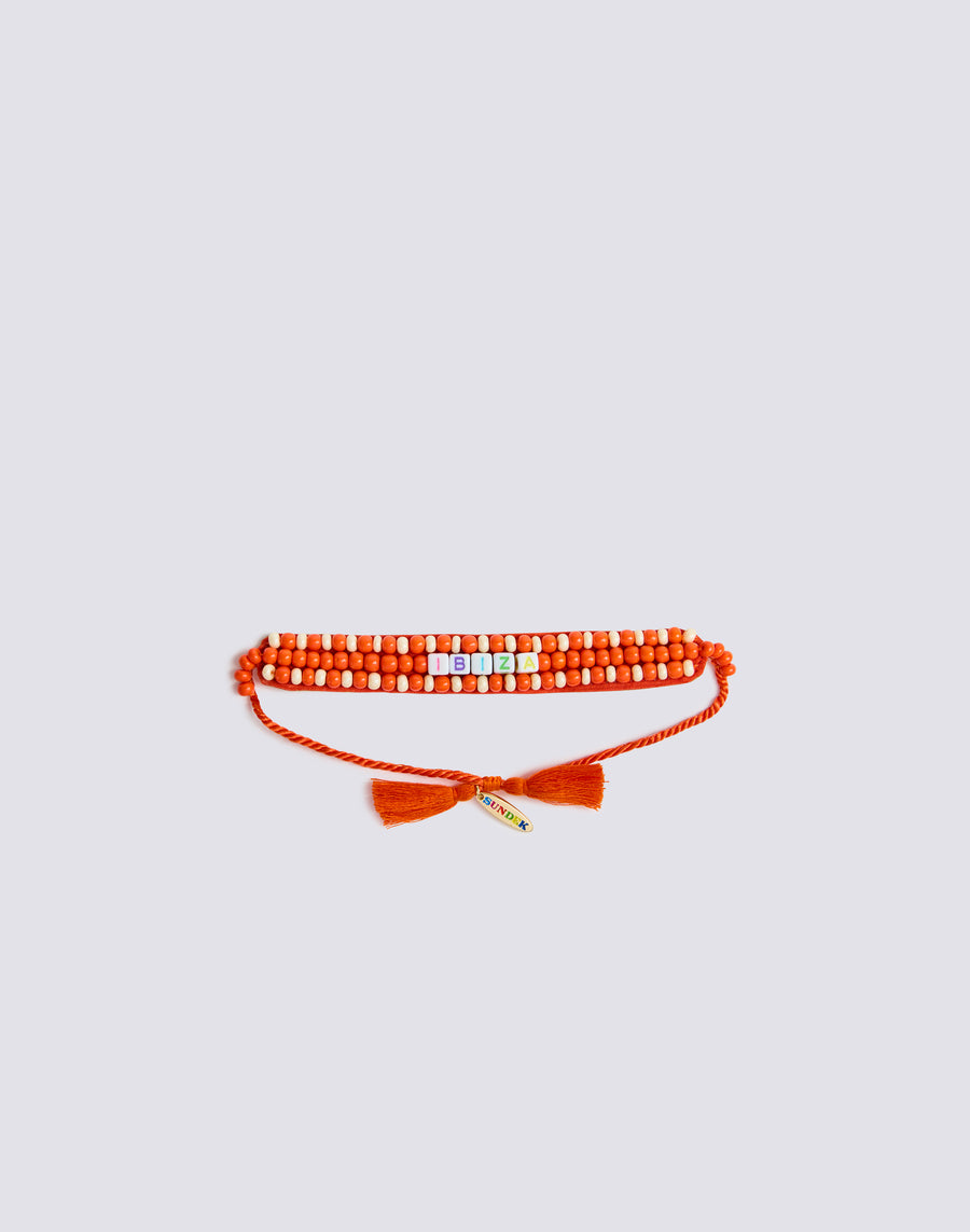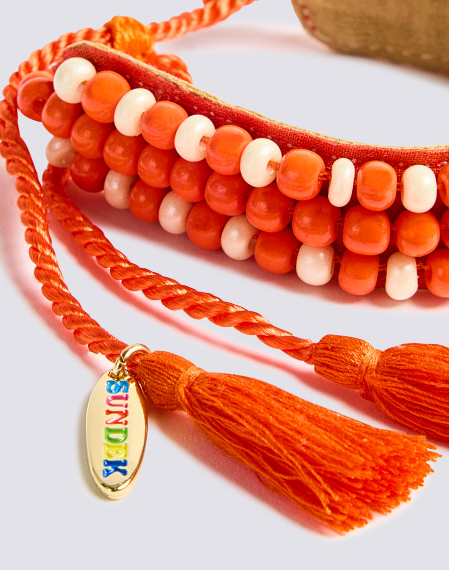 Hand embroidered bracelet with glass beads and cubes with multicolored letters. Featuring an adjustable closure with tassels on the bottom and a surf-shaped metal charm. It is sold together with its dustbag printed with our iconic SK23 pattern and gold-colored logo.
