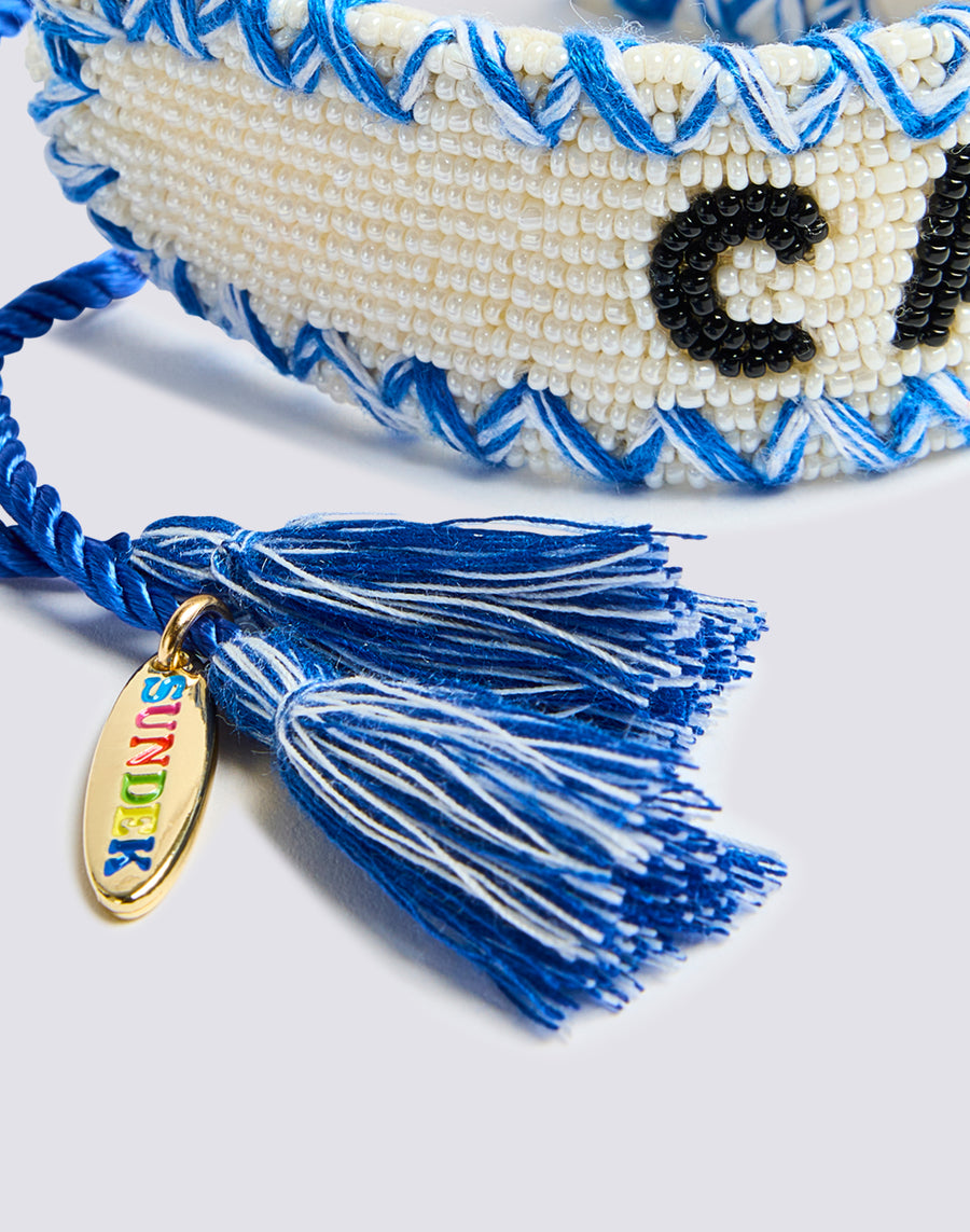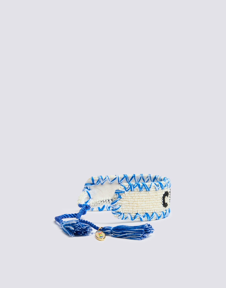 Hand embroidered bracelet with glass beads. Featuring an adjustable closure with tassels on the bottom and a surf-shaped metal charm. It is sold together with its dustbag printed with our iconic SK23 pattern and gold-colored logo.