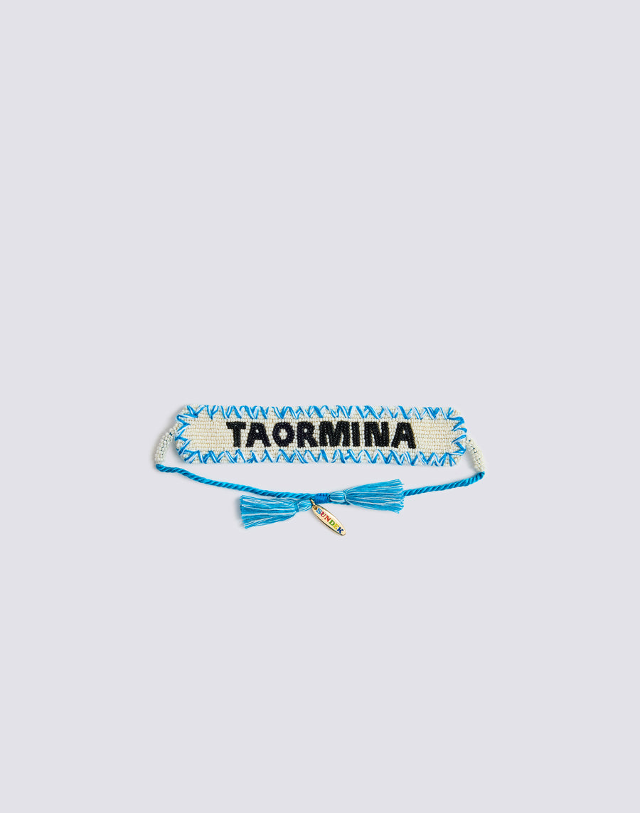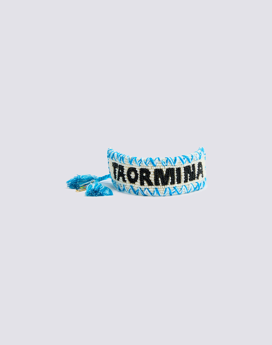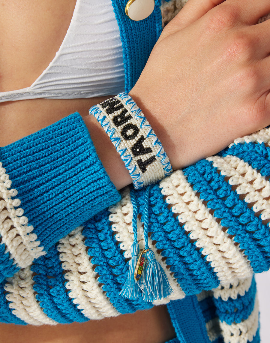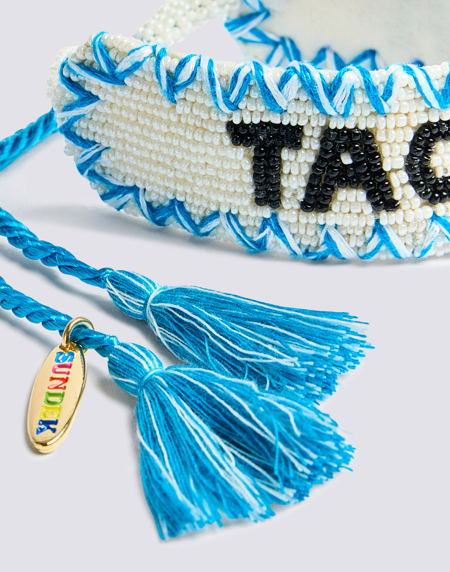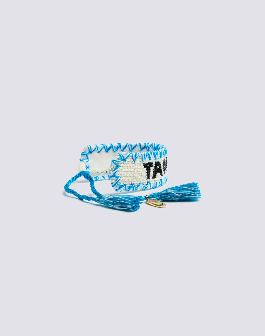 Hand embroidered bracelet with glass beads. Featuring an adjustable closure with tassels on the bottom and a surf-shaped metal charm. It is sold together with its dustbag printed with our iconic SK23 pattern and gold-colored logo.