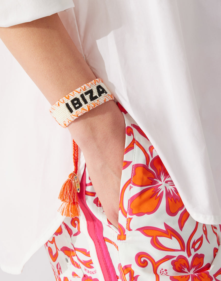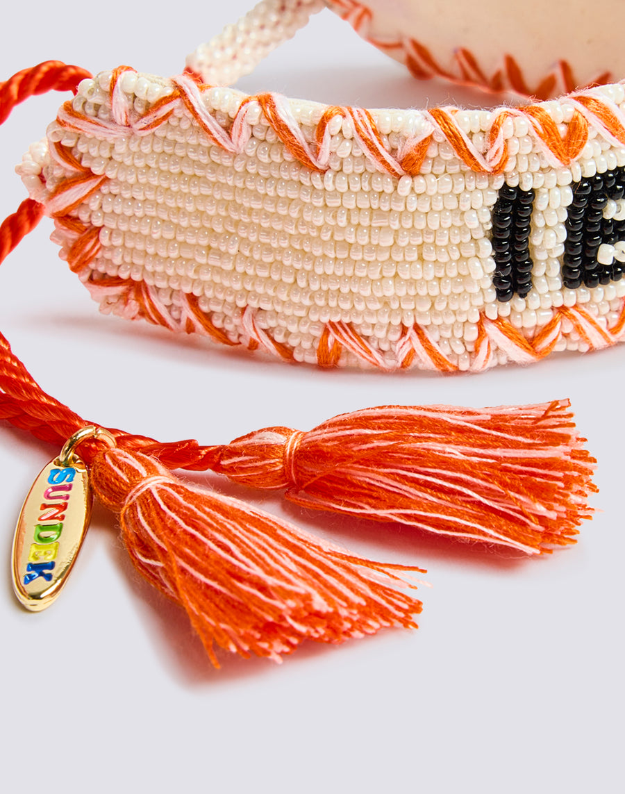 Hand embroidered bracelet with glass beads. Featuring an adjustable closure with tassels on the bottom and a surf-shaped metal charm. It is sold together with its dustbag printed with our iconic SK23 pattern and gold-colored logo.