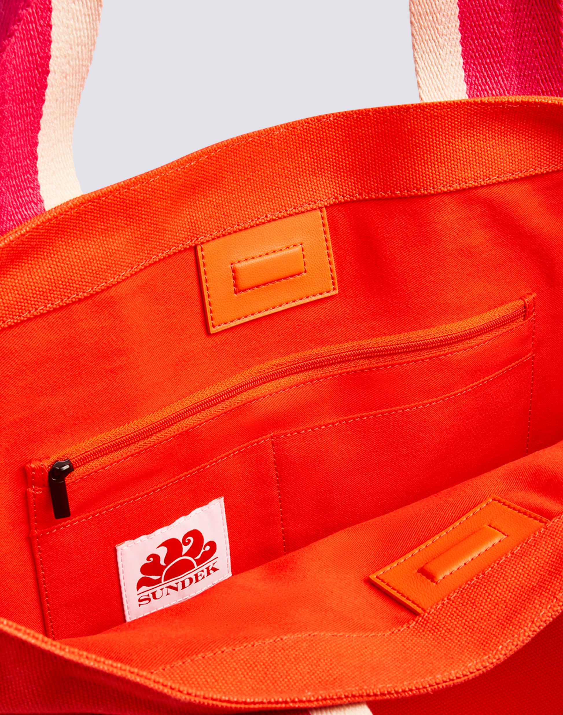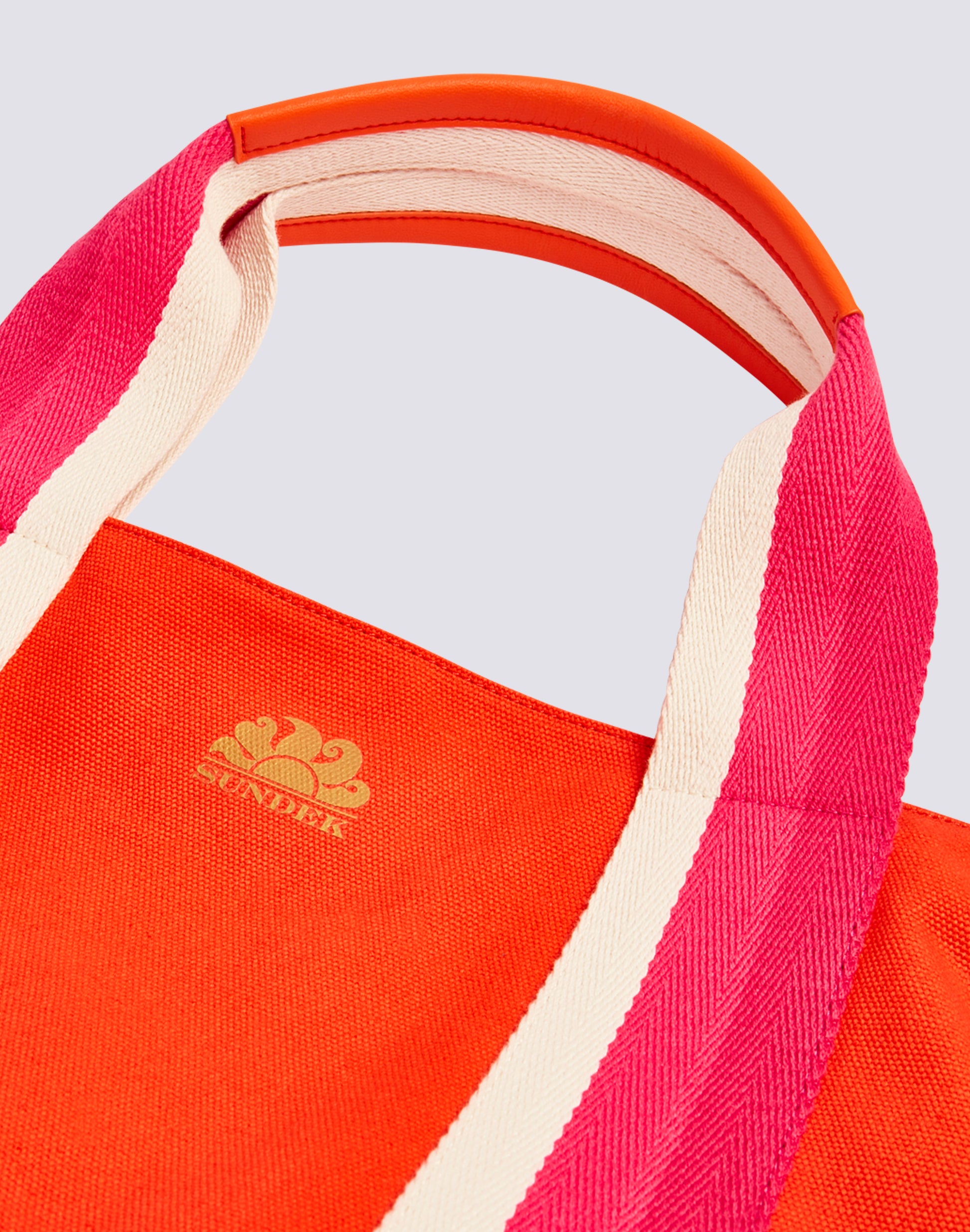 Lively shopping bag with contrasting rainbow details. Use it for your shopping moments or even as a beach bag.