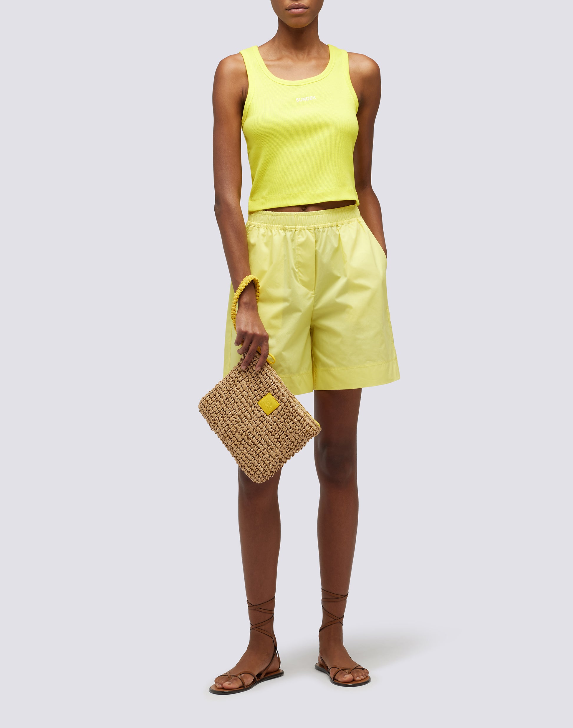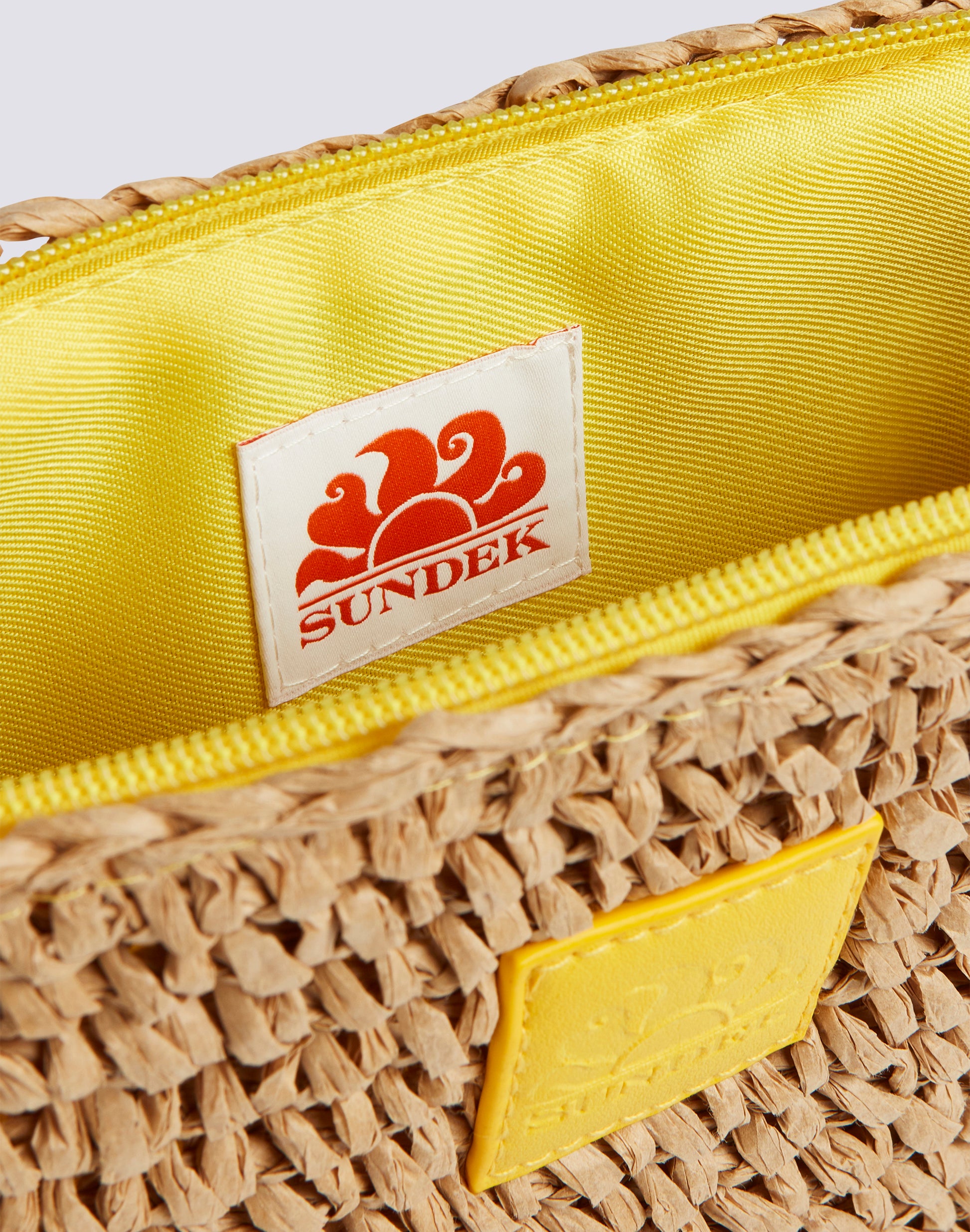 Mini clutch bag in straw-effect paper with hand loop and zip closure. The contrasting colors of the details make it lively. The small size makes it perfect for always carrying the necessary things with you.