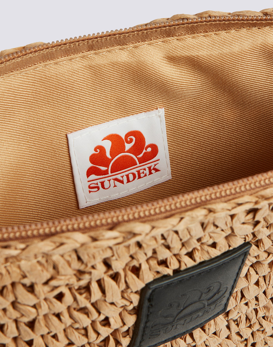 Mini clutch bag in straw-effect paper with hand loop and zip closure. The contrasting colors of the details make it lively. The small size makes it perfect for always carrying the necessary things with you.