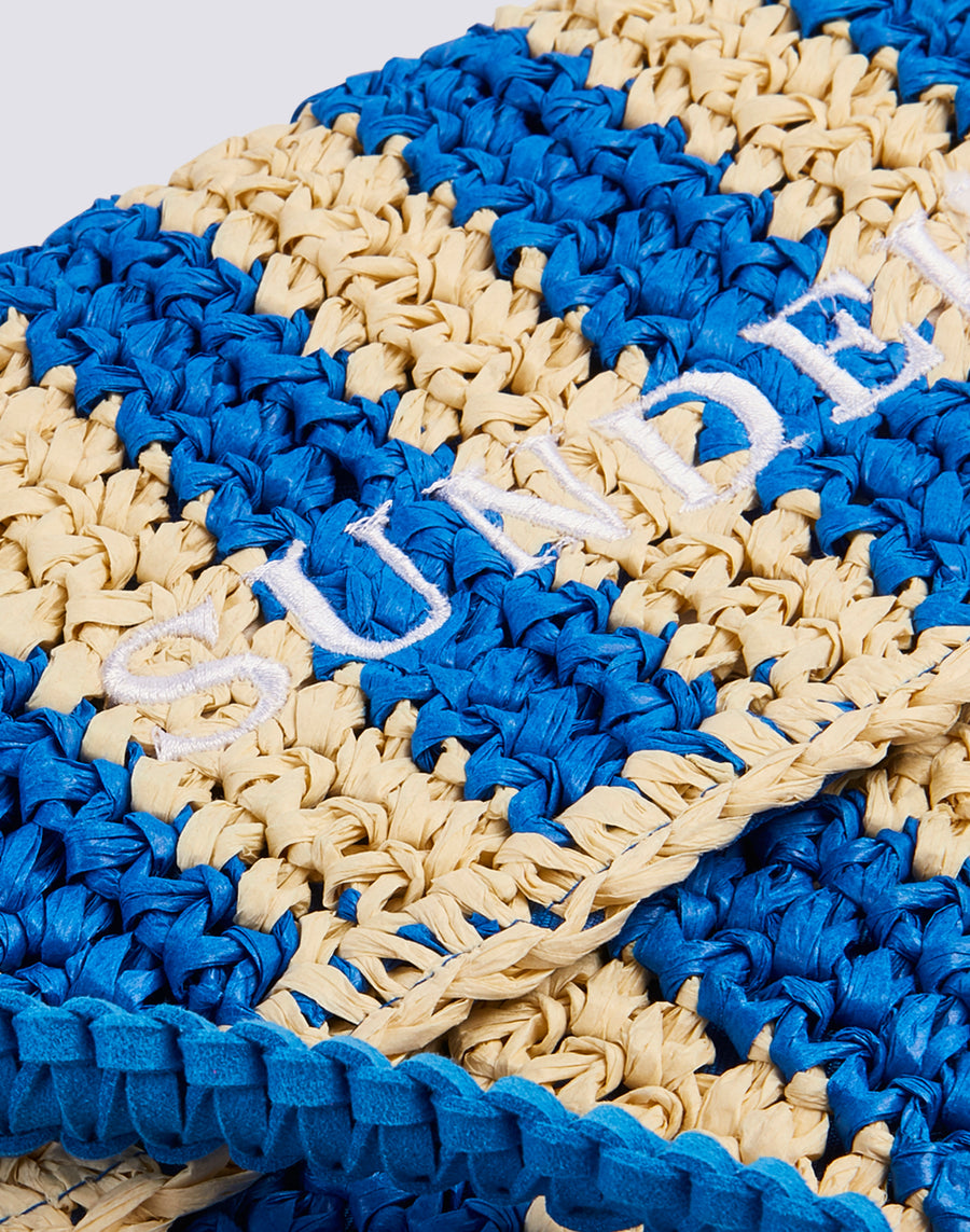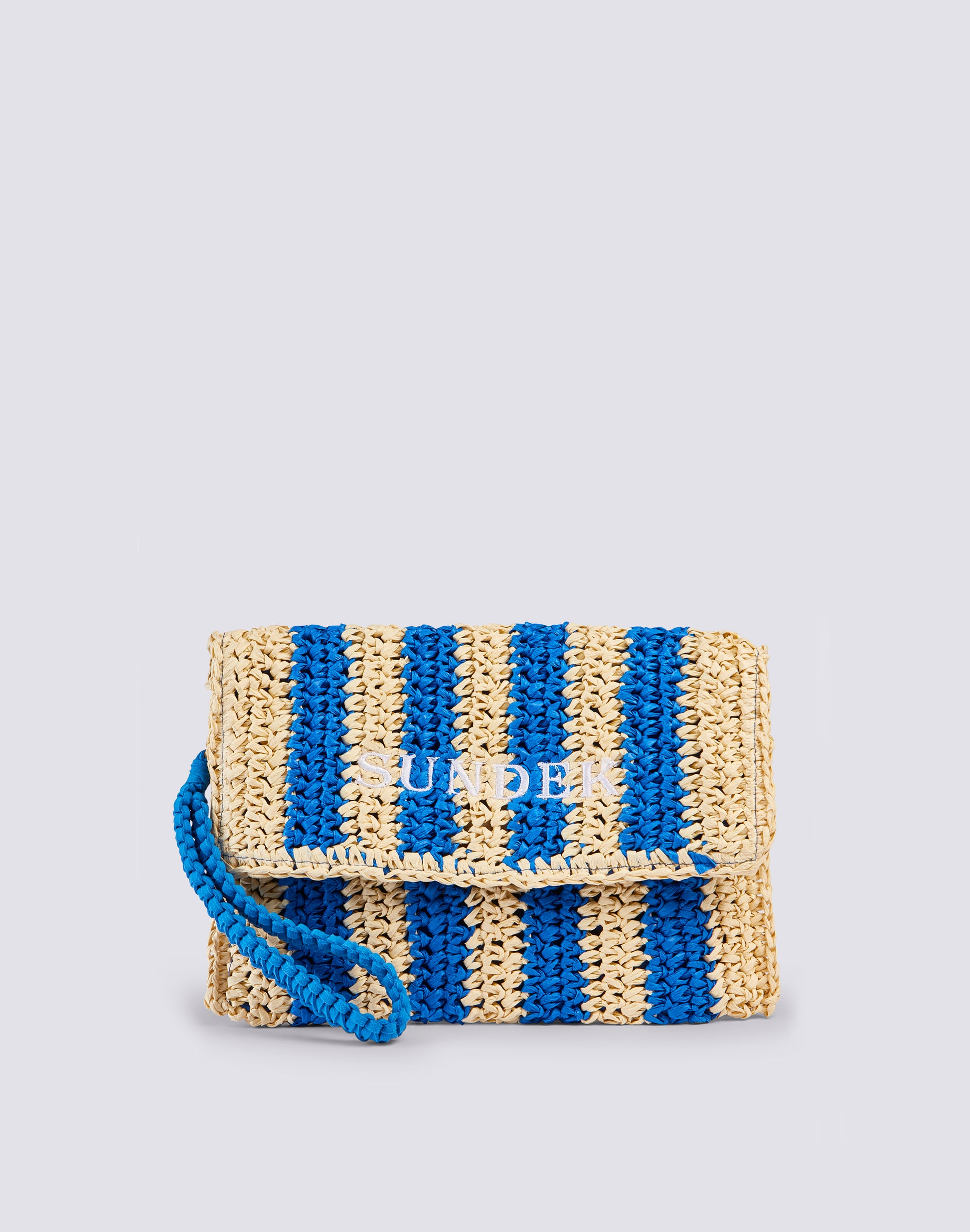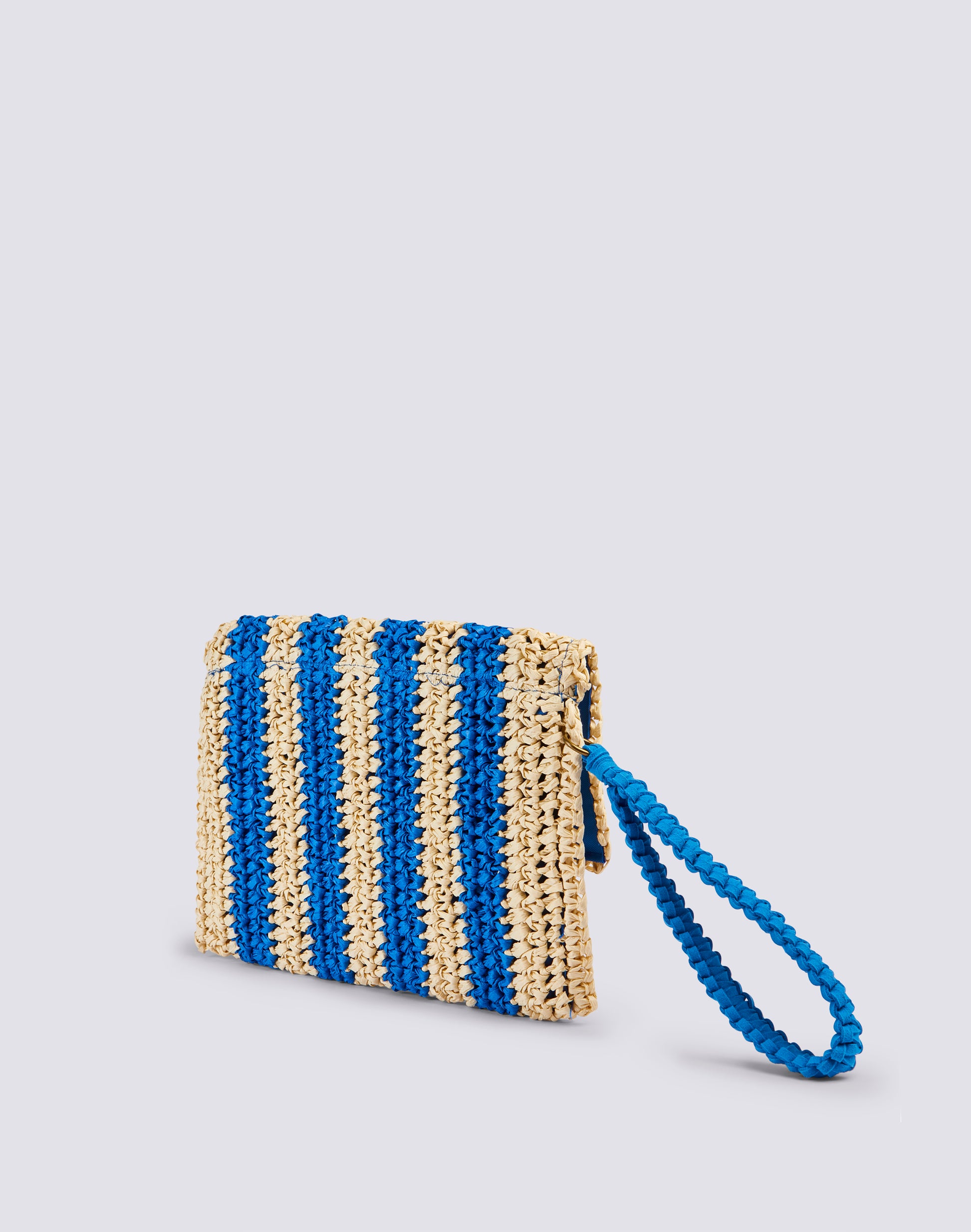 Izumi clutch bag in straw-effect paper with striped pattern. Equipped with a hand loop, it is convenient to carry around thanks to its small size. The striped pattern makes it lively and original.