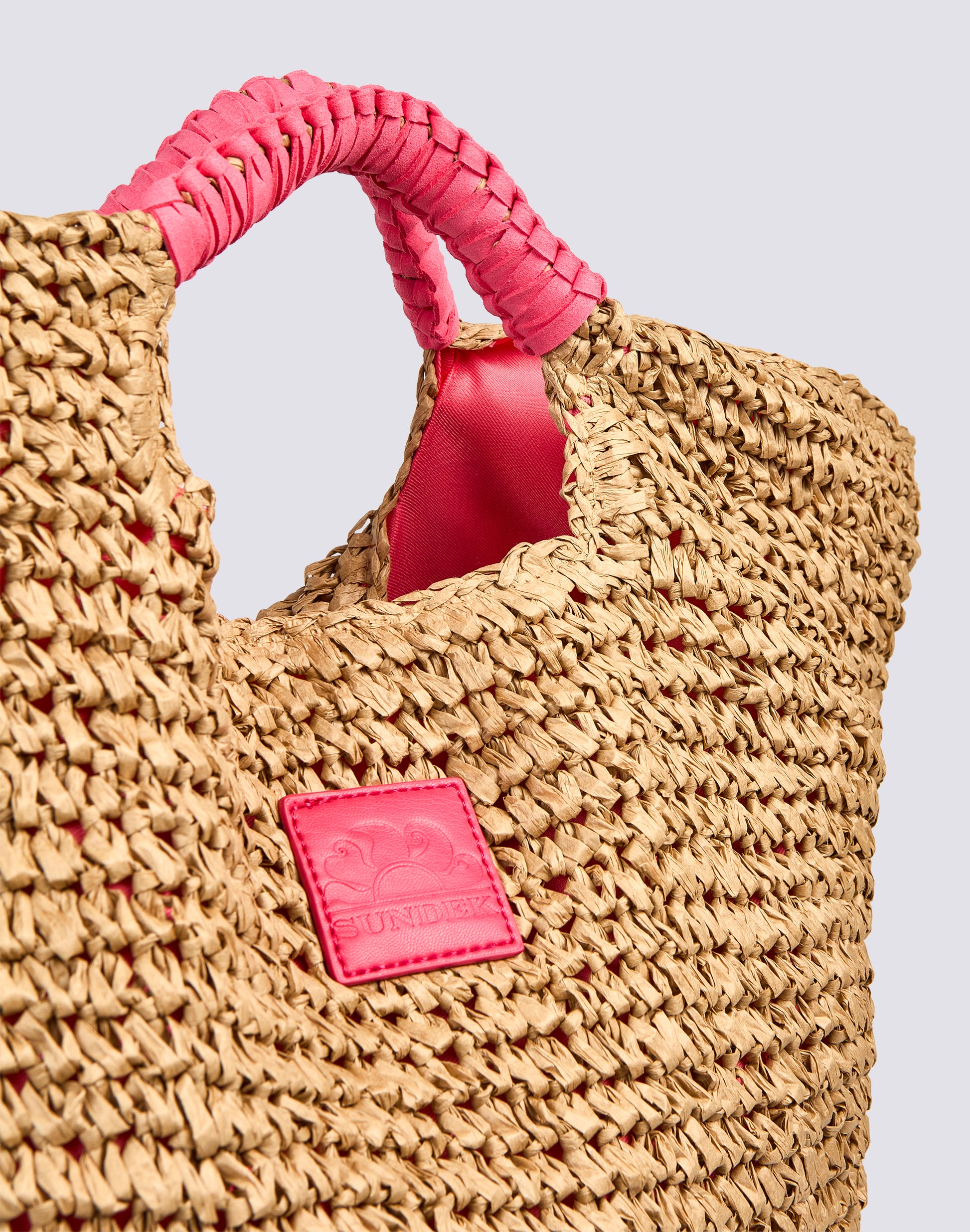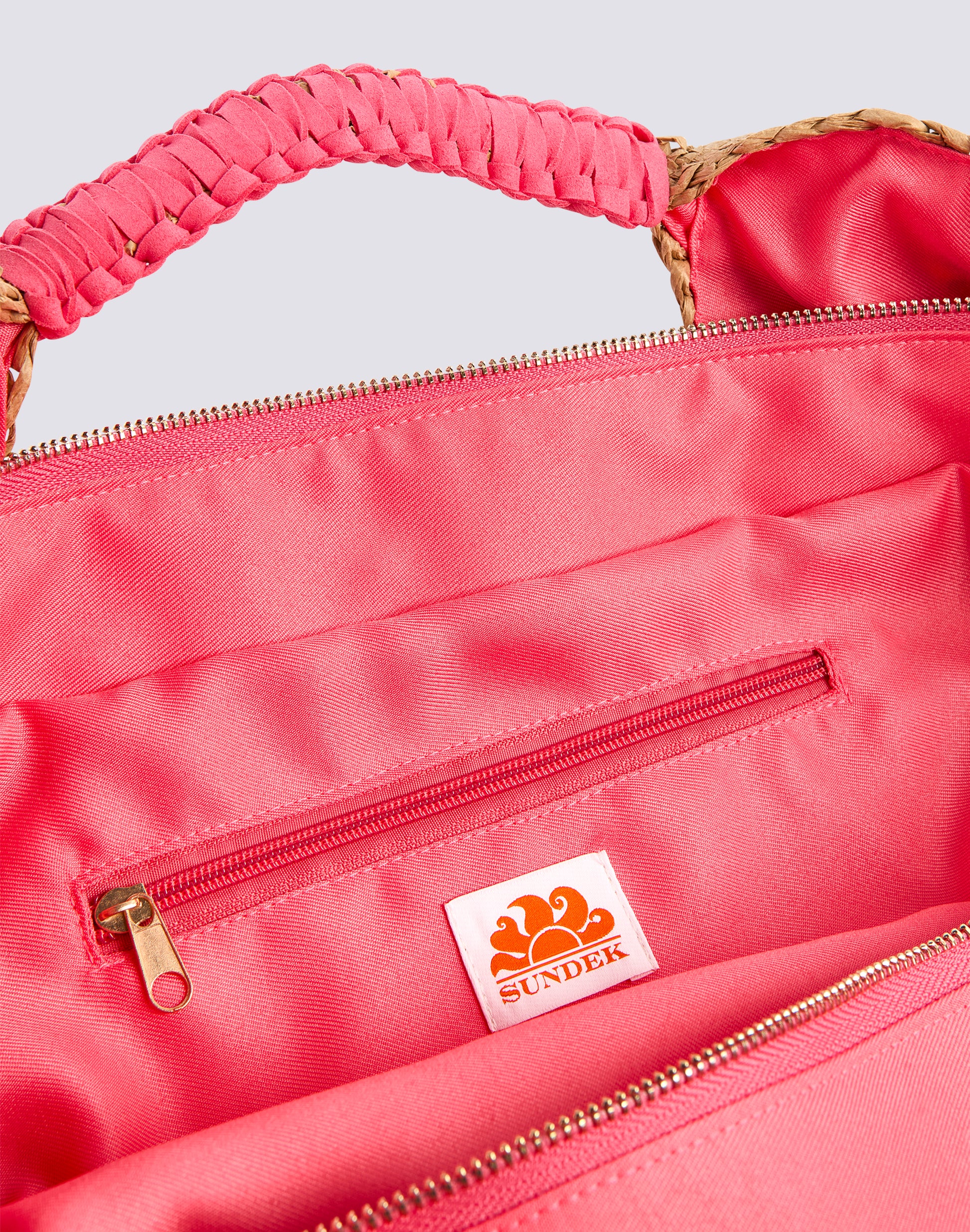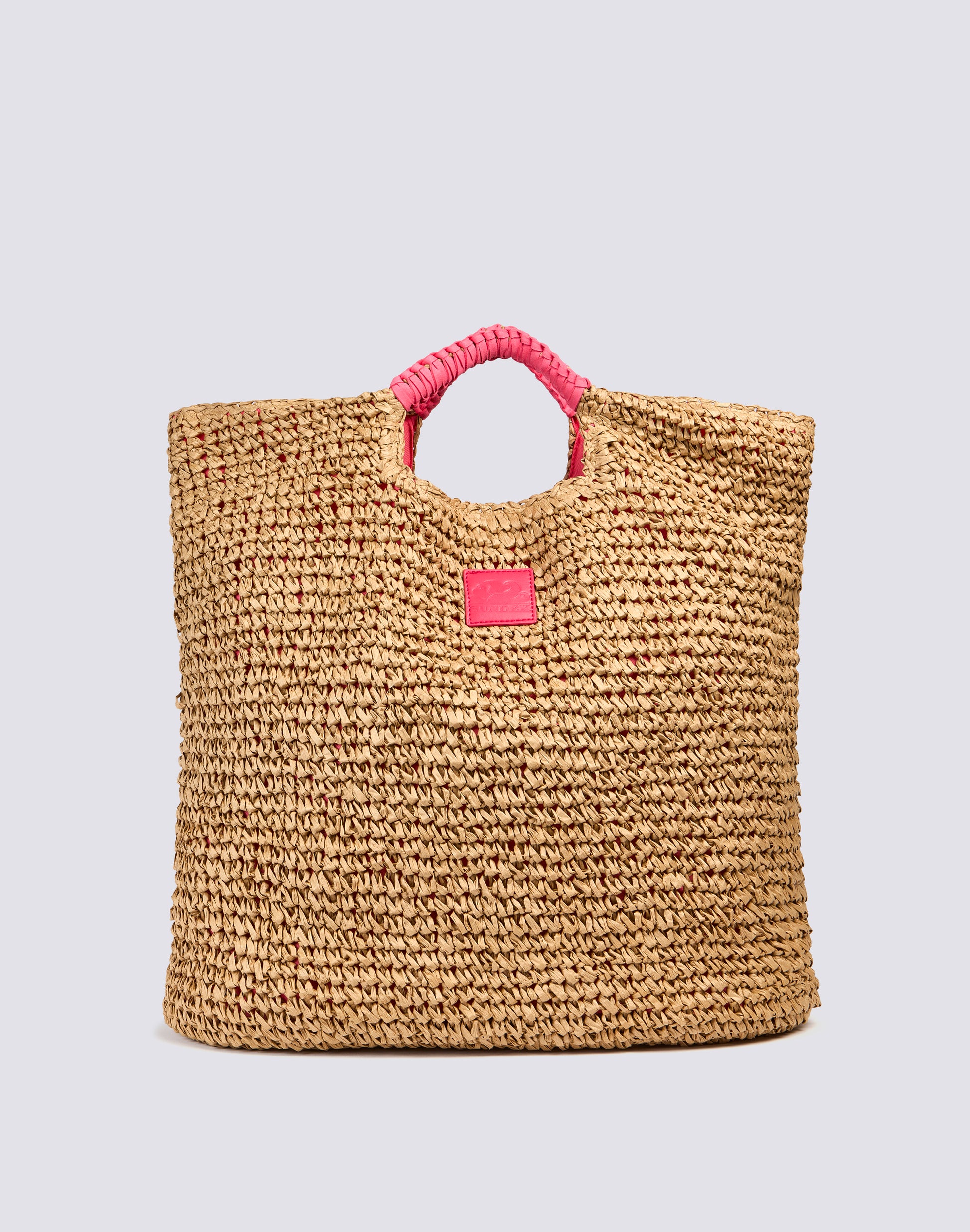 Shopping bag in straw-effect paper with contrasting handles. Roomy, equipped with a central zip closure, it is ideal for a walk or as a beach bag.