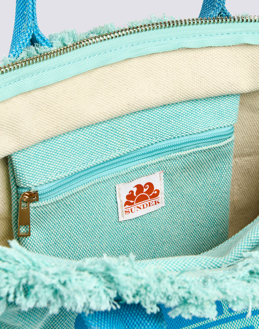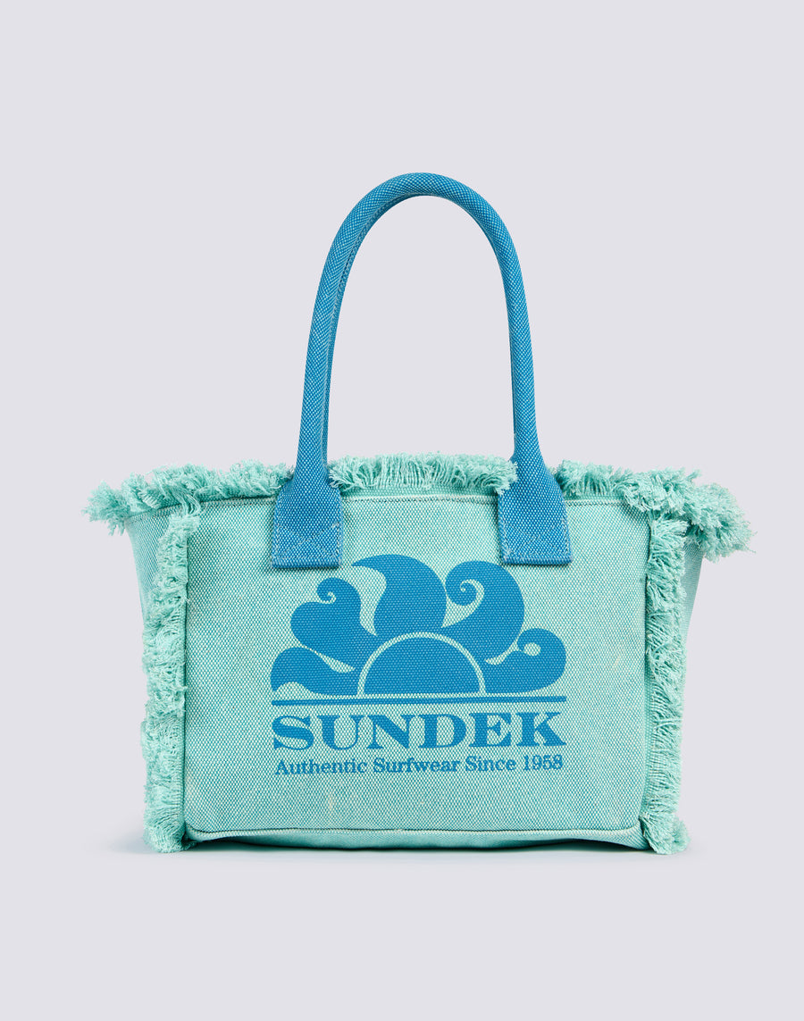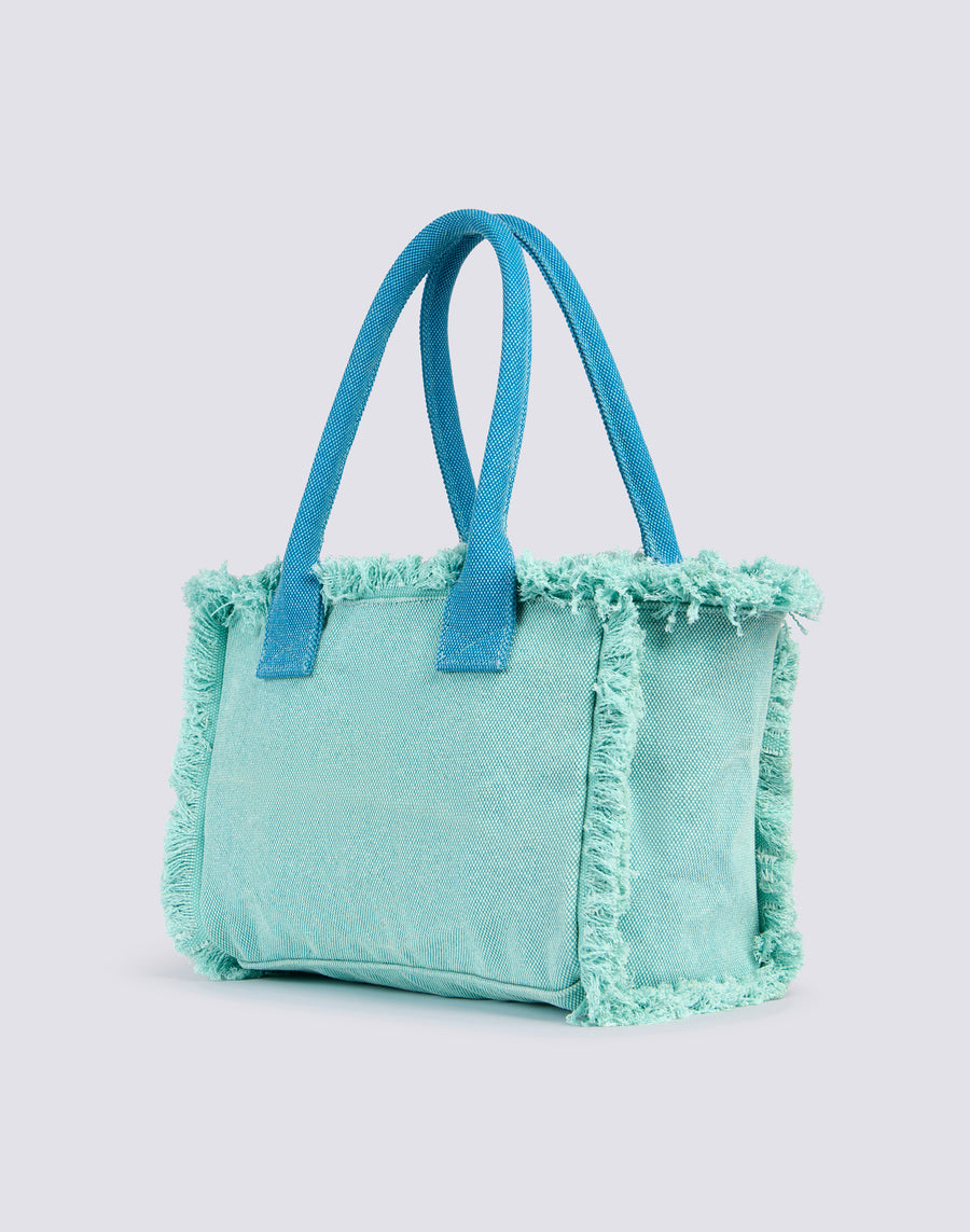 Regular-sized tote bag with a stone washed effect, central zip, large printed logo and gold trim. The fringe detail makes this model suitable for bold looks.
