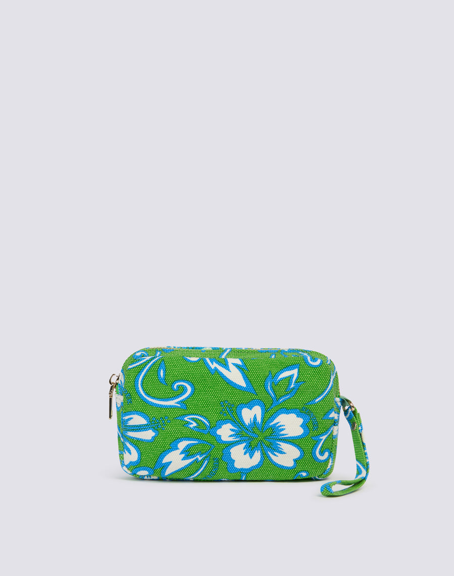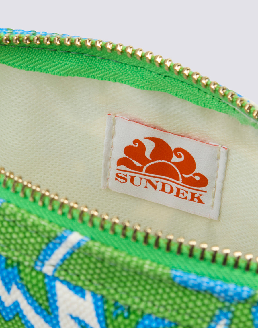 Stone washed effect clutch bag with SK23 print, zip fastening, loop for hanging and gold trim.