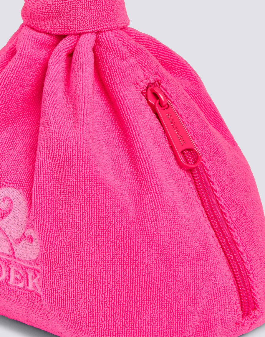 Pretty terry cloth clutch bag with decorative knot and embroidered logo.