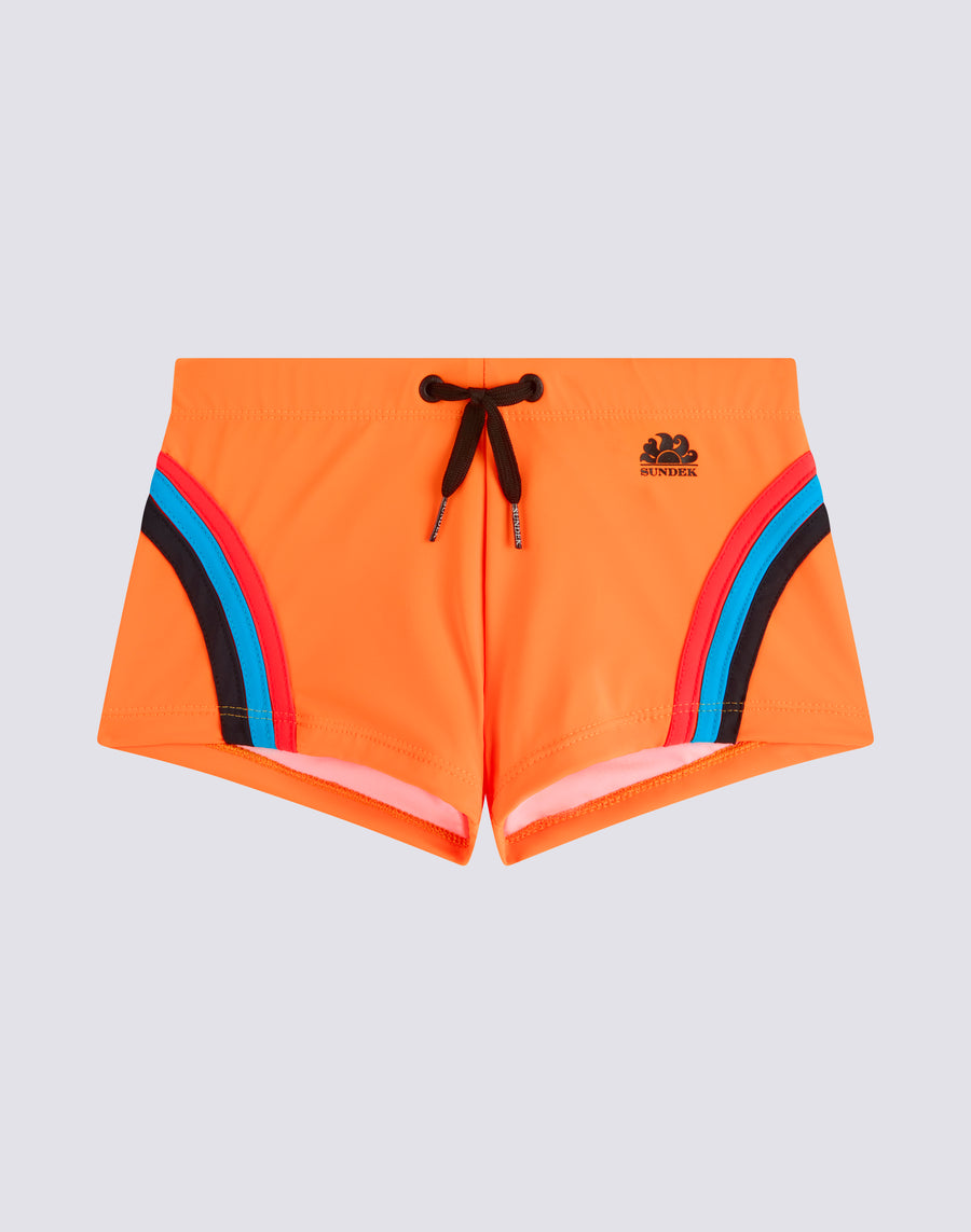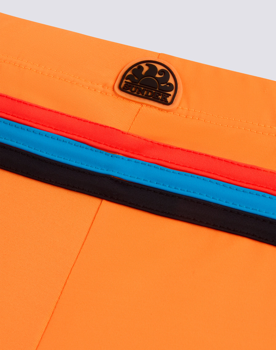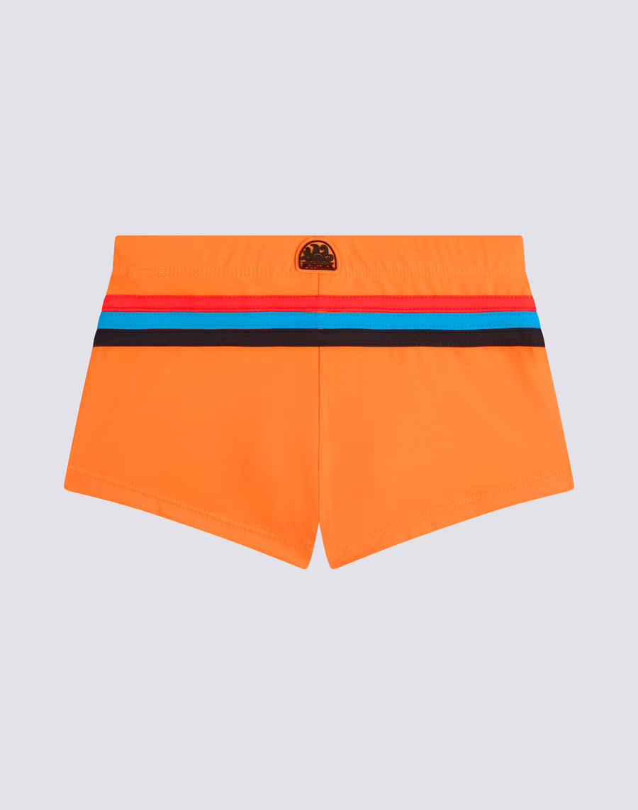 The children's beach boxer shorts are all about colour and not forgetting the environment, because they are made of ECONYL® regenerated nylon. Comfortable thanks to the elastic waistband and adjustable drawstring, it is the swimming costume that your child can easily wear to play and swim.