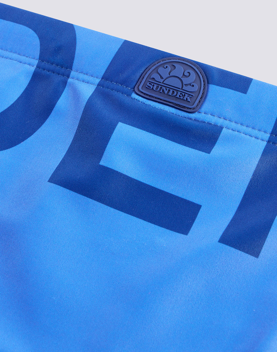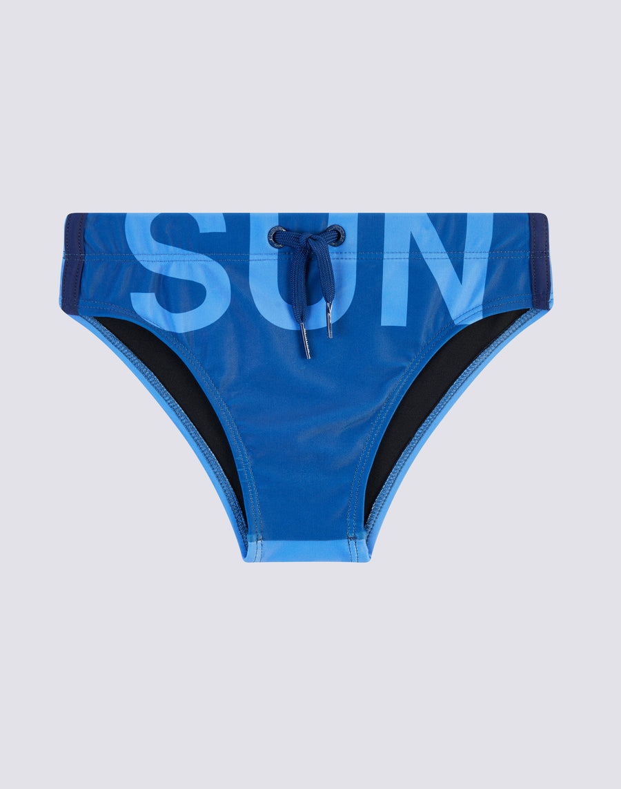 Two-tone fabric with contrasting writing for these boys' swim briefs. Maxi logo writing printed on front and back and rubber logo patch. Lined. Outer seam length: 6 cm (size 6 years).