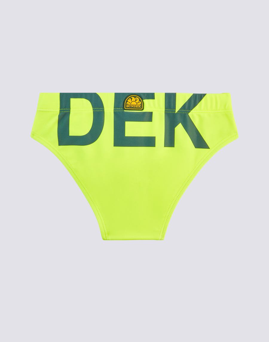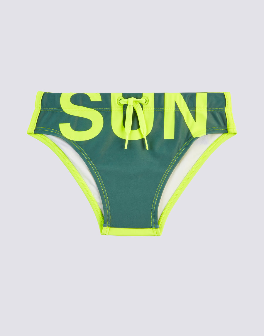 Two-tone fabric with contrasting writing for these boys' swim briefs. Maxi logo writing printed on front and back and rubber logo patch. Lined. Outer seam length: 6 cm (size 6 years).
