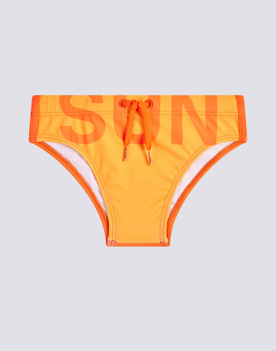 Two-tone fabric with contrasting lettering for this children's swimming brief. Maxi logo print on front and back and rubber logo patch. Lined. External seam length: 6 cm (size 6 years).