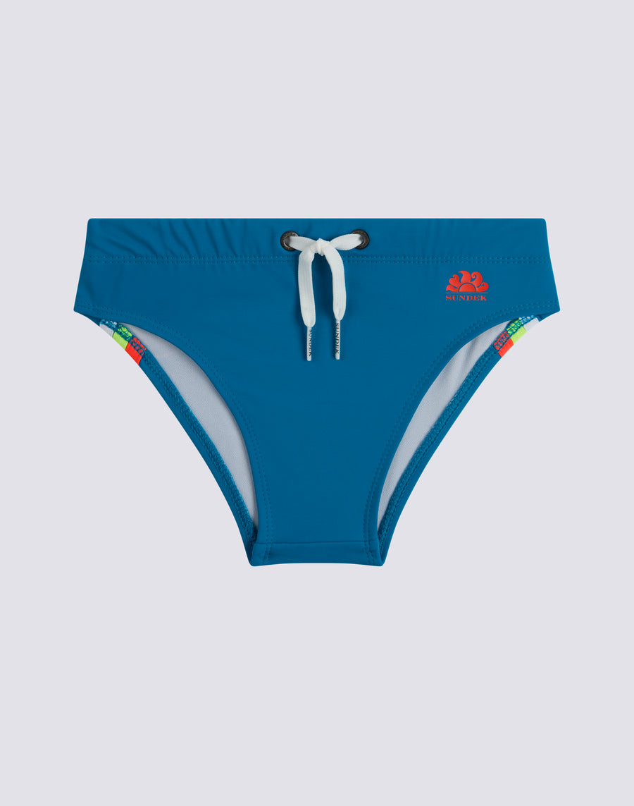 Children's swim briefs with rainbow detailing on the back, drawstring and elasticated waist.