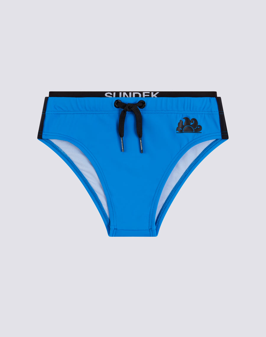Children's swim briefs with logoed elastic band at the waist, in contrasting colour. Made of regenerated ECONYL nylon fabric. With an elasticated waist, it will be super comfortable both for the bathroom and for playing in the sand.