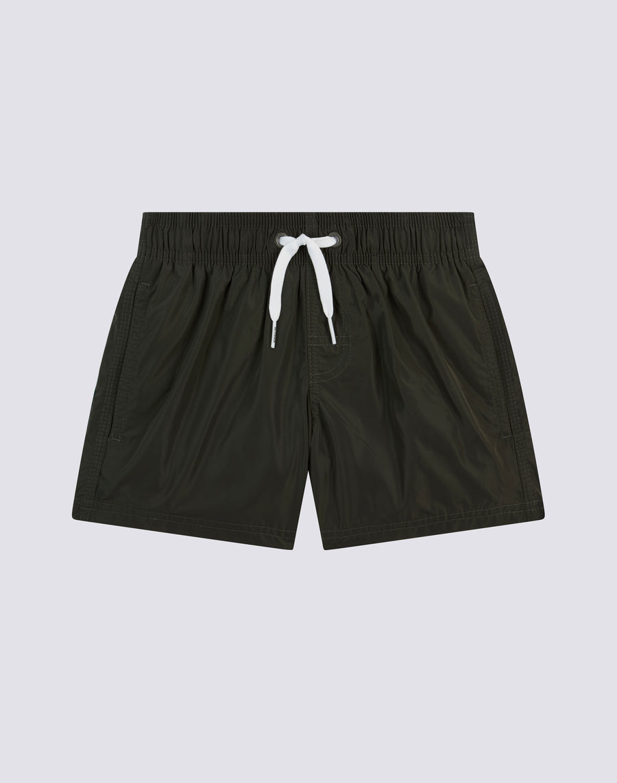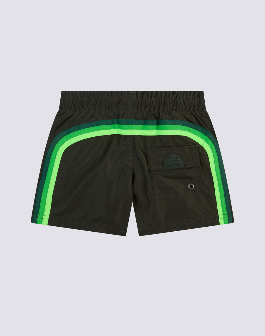 Plain-coloured children's short shorts with bright colours and back pocket with tone-on-tone patch and Velcro fastener. Lightweight, durable, dries very quickly and is made of Memory polyester, a technical fabric that retains its shape over time. It has our classic three-needle stitching for added strength and our iconic rainbow on the back.
