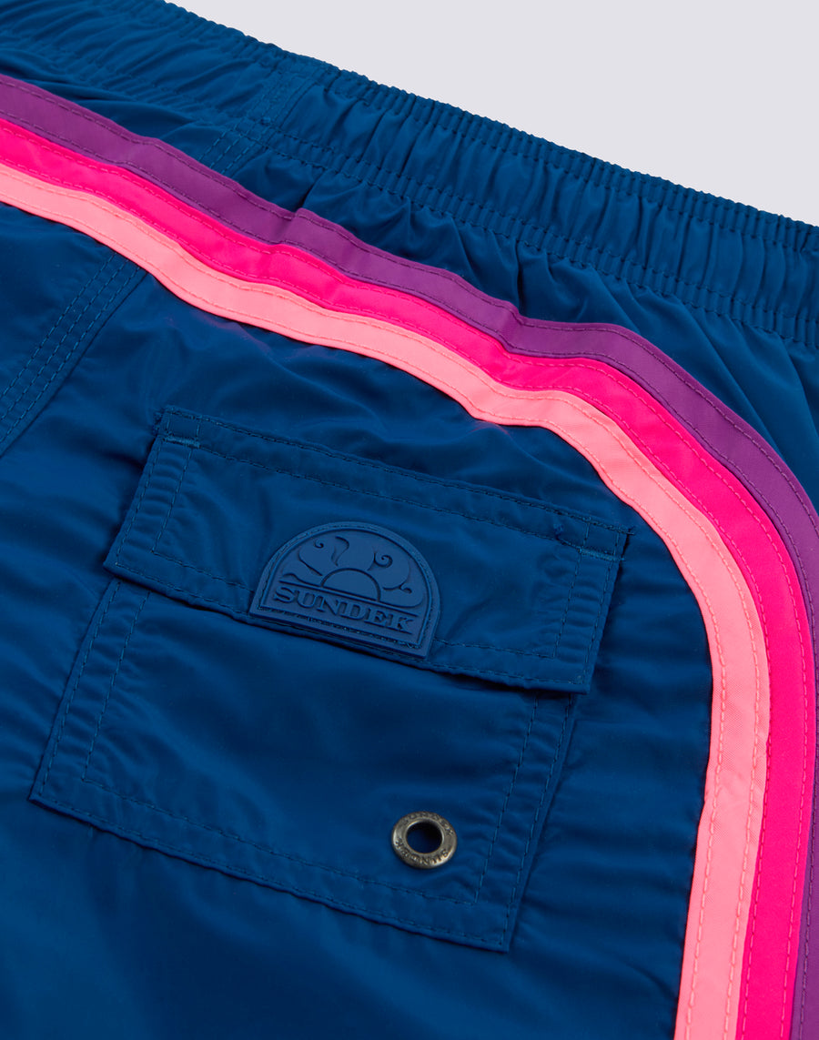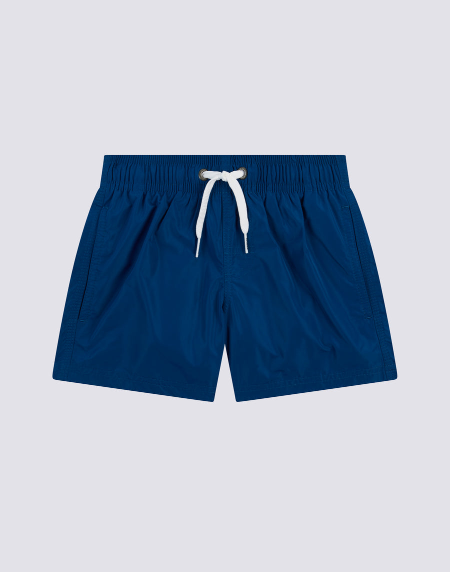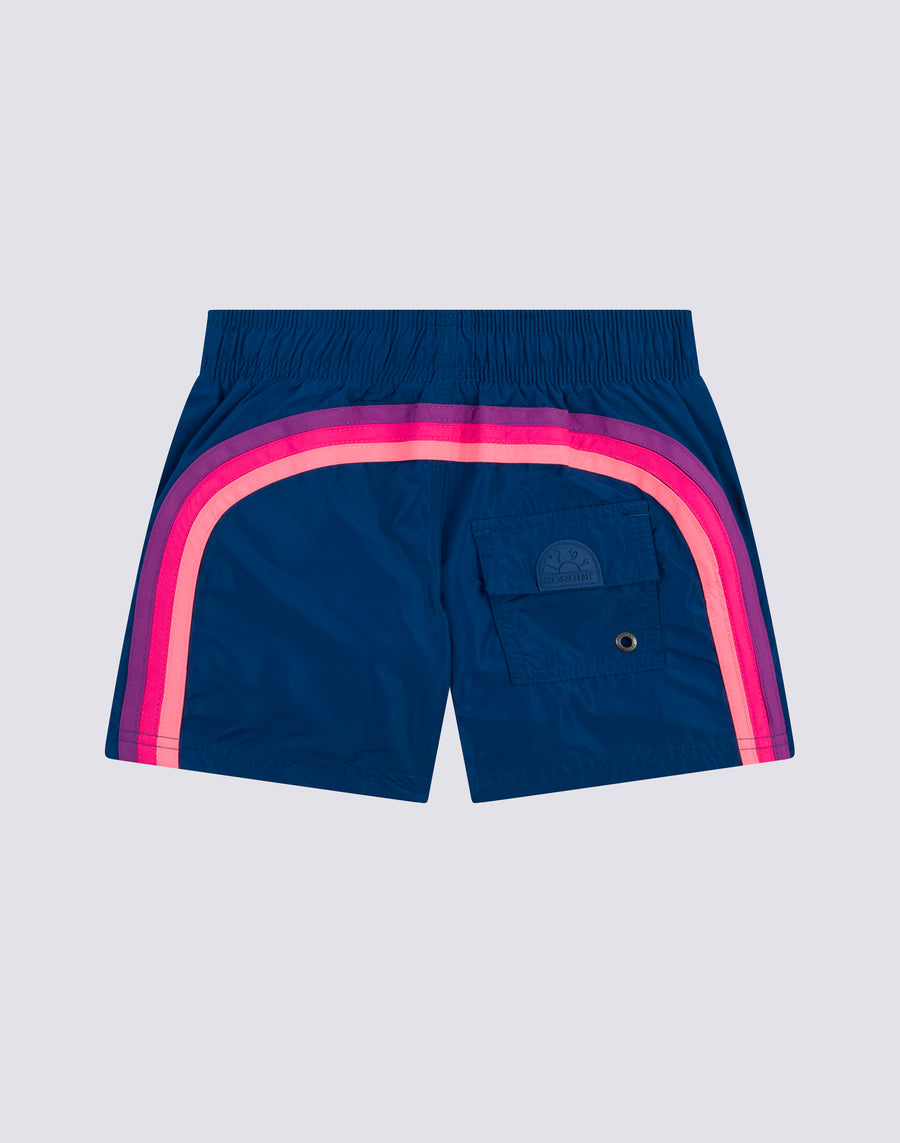Plain-coloured children's short shorts with bright colours and back pocket with tone-on-tone patch and Velcro fastener. Lightweight, durable, dries very quickly and is made of Memory polyester, a technical fabric that retains its shape over time. It has our classic three-needle stitching for added strength and our iconic rainbow on the back.