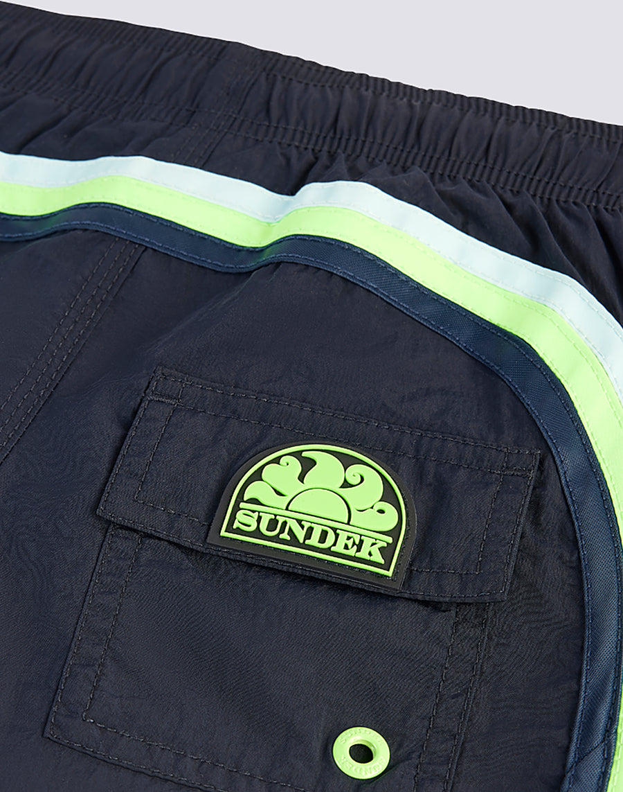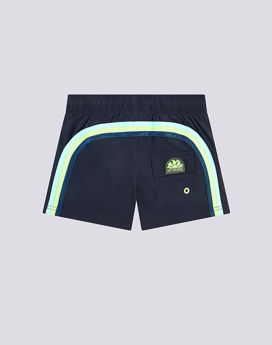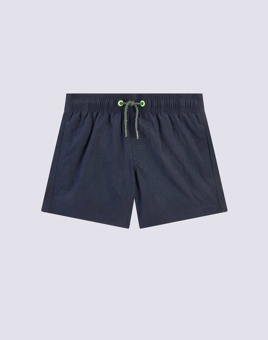 Intense color and hyper-comfortable, quick-drying fabric for these boys' swim shorts. A model that will accompany your child in his thousand holiday activities, perfect for moving and playing in complete freedom. it's made from our heritage nylon-taffeta fabric and constructed with three-needle stitching that makes it durable over time. To pack in your suitcase, year after year.