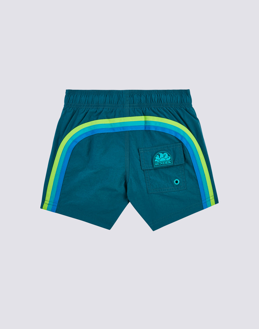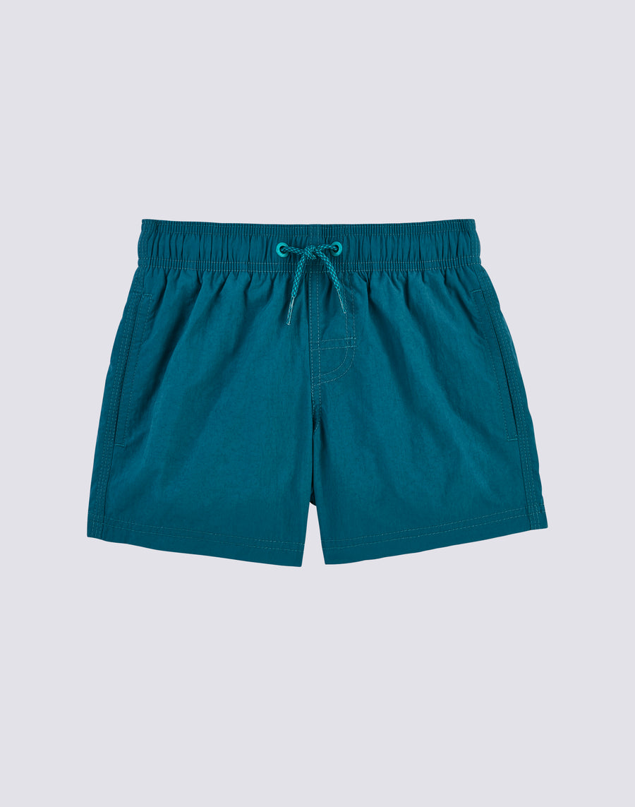 Intense color and hyper-comfortable, quick-drying fabric for these boys' swim shorts. A model that will accompany your child in his thousand holiday activities, perfect for moving and playing in complete freedom. It's made from our heritage nylon-taffeta fabric and constructed with three-needle stitching that makes it durable over time. To pack in your suitcase, year after year.
