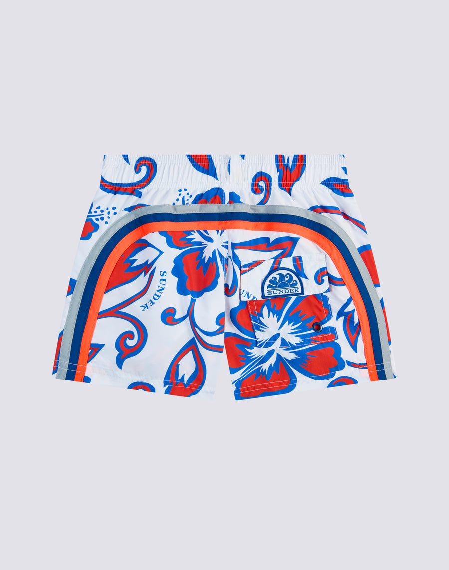 Swimshorts with elasticated drawstring waist, in lightweight Repreve® fabric recycled from plastic bottles. Iconic SK23 print and the traditional Sundek rainbow on the back. Outer thigh width 10.25"/26 cm (size 6 years). Also matches briefs in the same pattern!