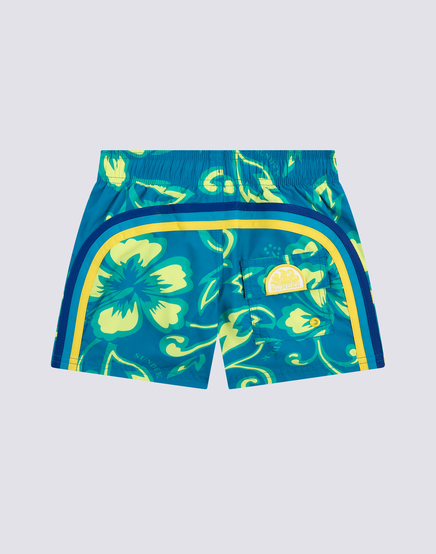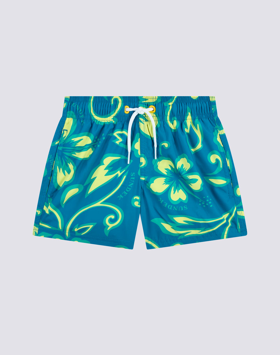 Swimshorts with elasticated drawstring waist, in lightweight Repreve® fabric recycled from plastic bottles. Iconic SK23 print and the traditional Sundek rainbow on the back. Outer thigh width 10.25"/26 cm (size 6 years). Also matches briefs in the same pattern!